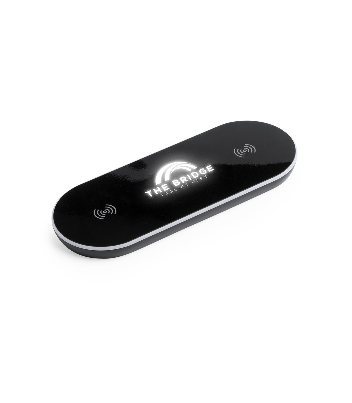 Cargador inalámbrico para carga simultánea de hasta 2 dispositivos. En elegante color negro, con luz led interior y un recubrimiento exterior especialmente diseñado para marcaje en láser, con el que conseguirá que su publicidad o marca quede iluminada con luz blanca. Base antideslizante y compatible con dispositivos equipados con tecnología de carga inalámbrica. Presentado en atractiva caja de diseño. Cable USB incluido.