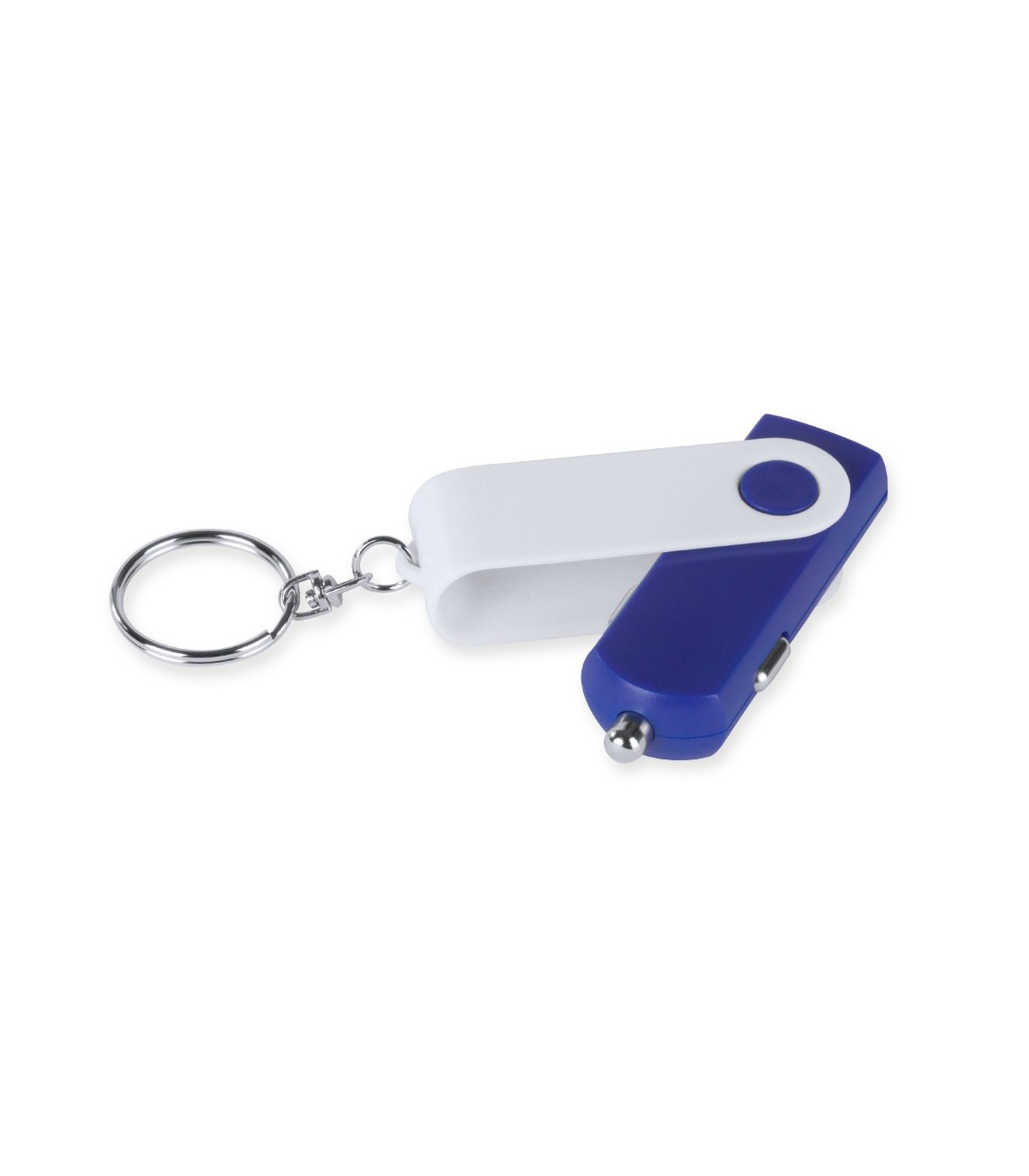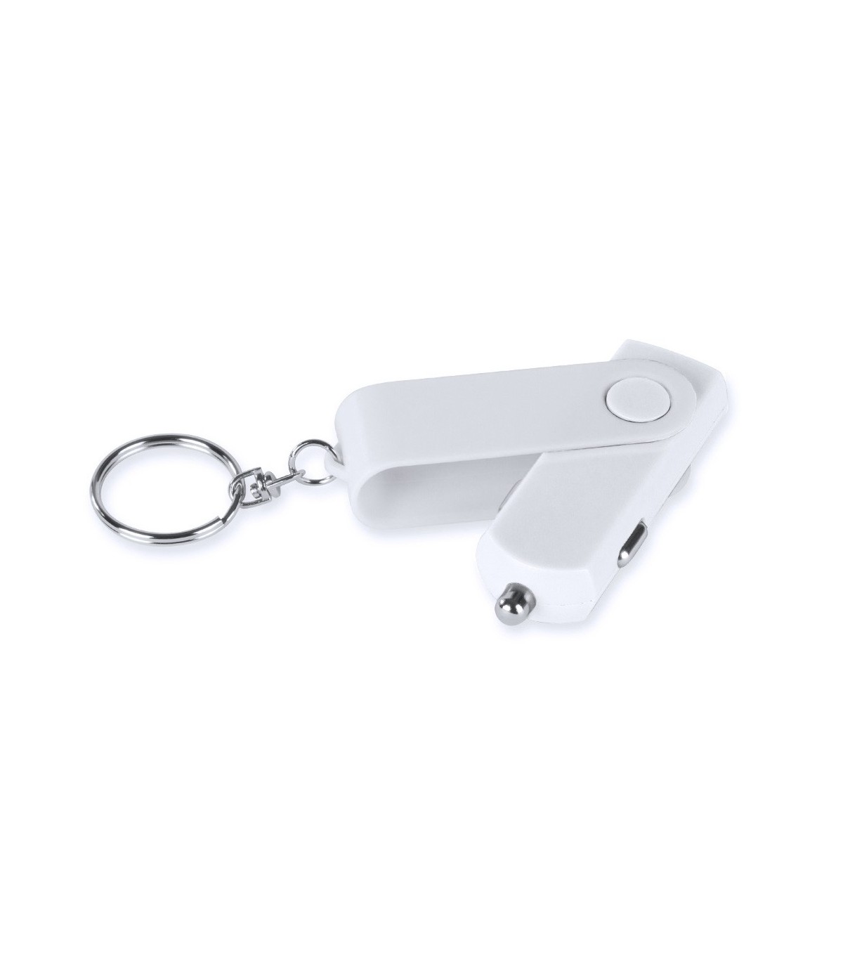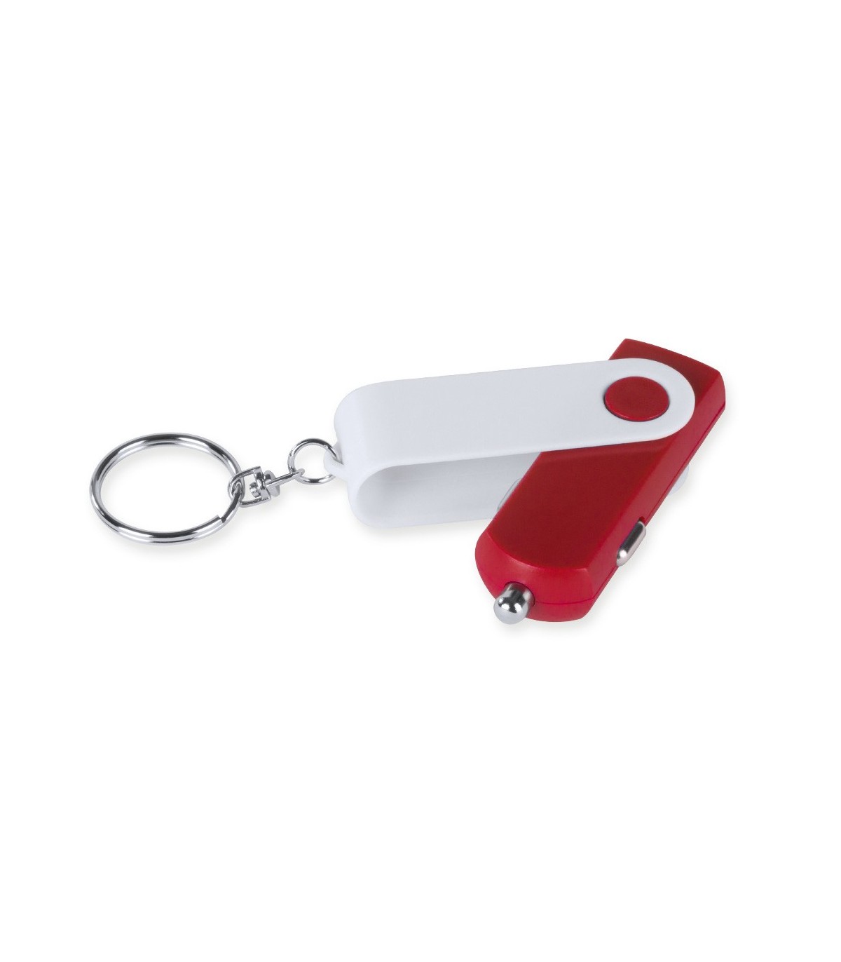Cargador llavero USB para coche de 1.000 mA de capacidad de carga en forma de llavero plegable con mecanismo twist mechanism, en colores variados y con led indicador de carga. Presentado en caja individual.