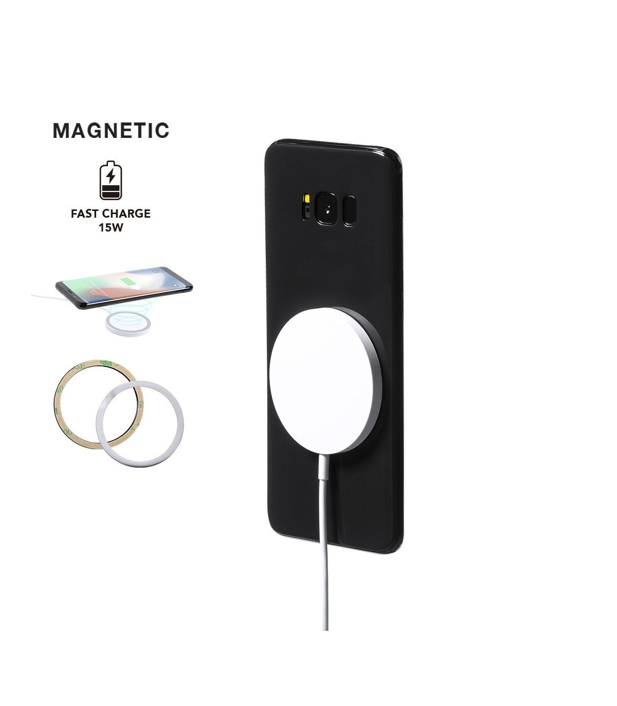 Cargadores inalámbricos magnético con carga de 15W. Cable con conexión USB de 1m. Accesorio metálico con adhesivo 3M. Personalizados con logo.