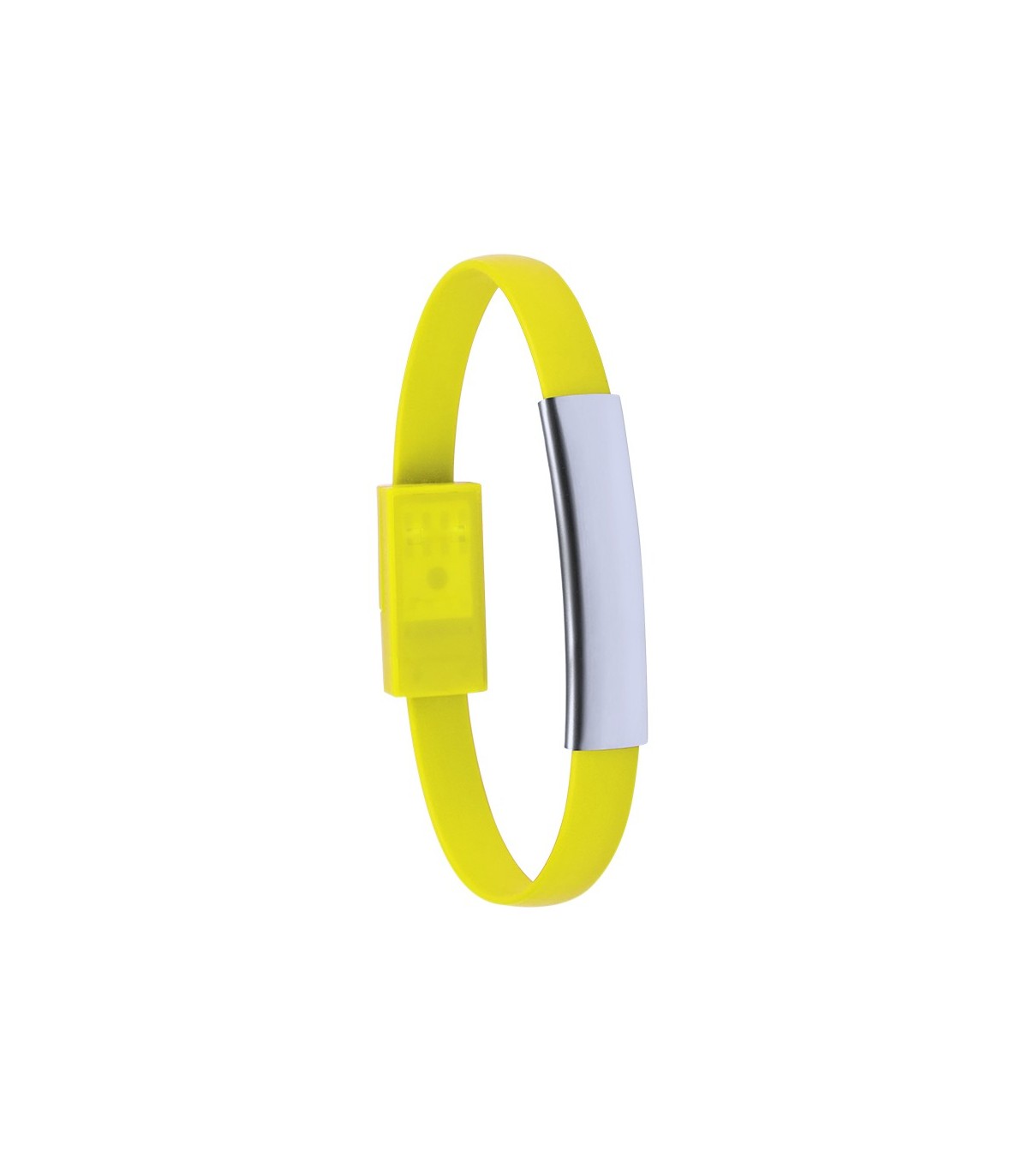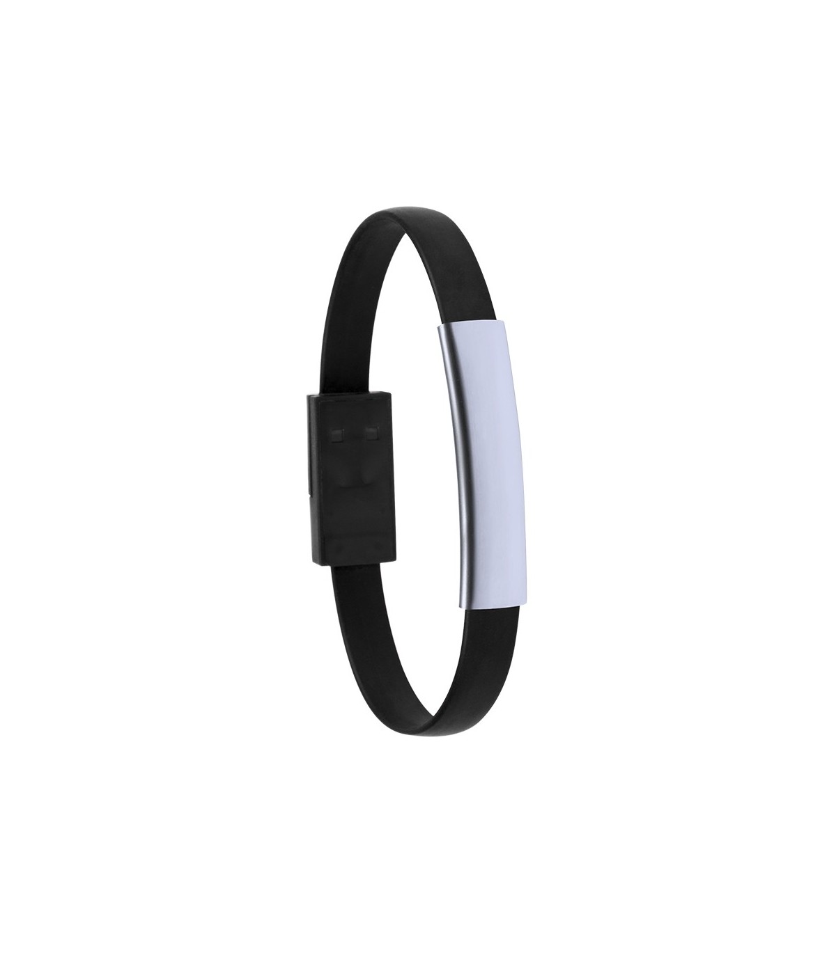 Pulsera-cable cargador en suave goma, con conexión Tipo-C y elegante pieza central de aluminio especialmente diseñada para marcaje en láser. Presentada en atractiva bolsa de diseño con autocierre.