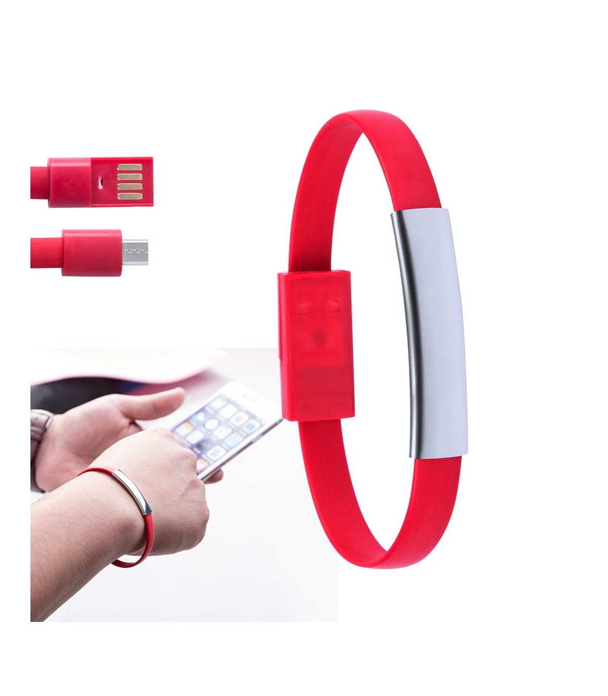 Pulseras cable cargador promocionales en suave goma, con conexión Tipo-C y elegante pieza central de aluminio especialmente diseñada para marcaje en láser.