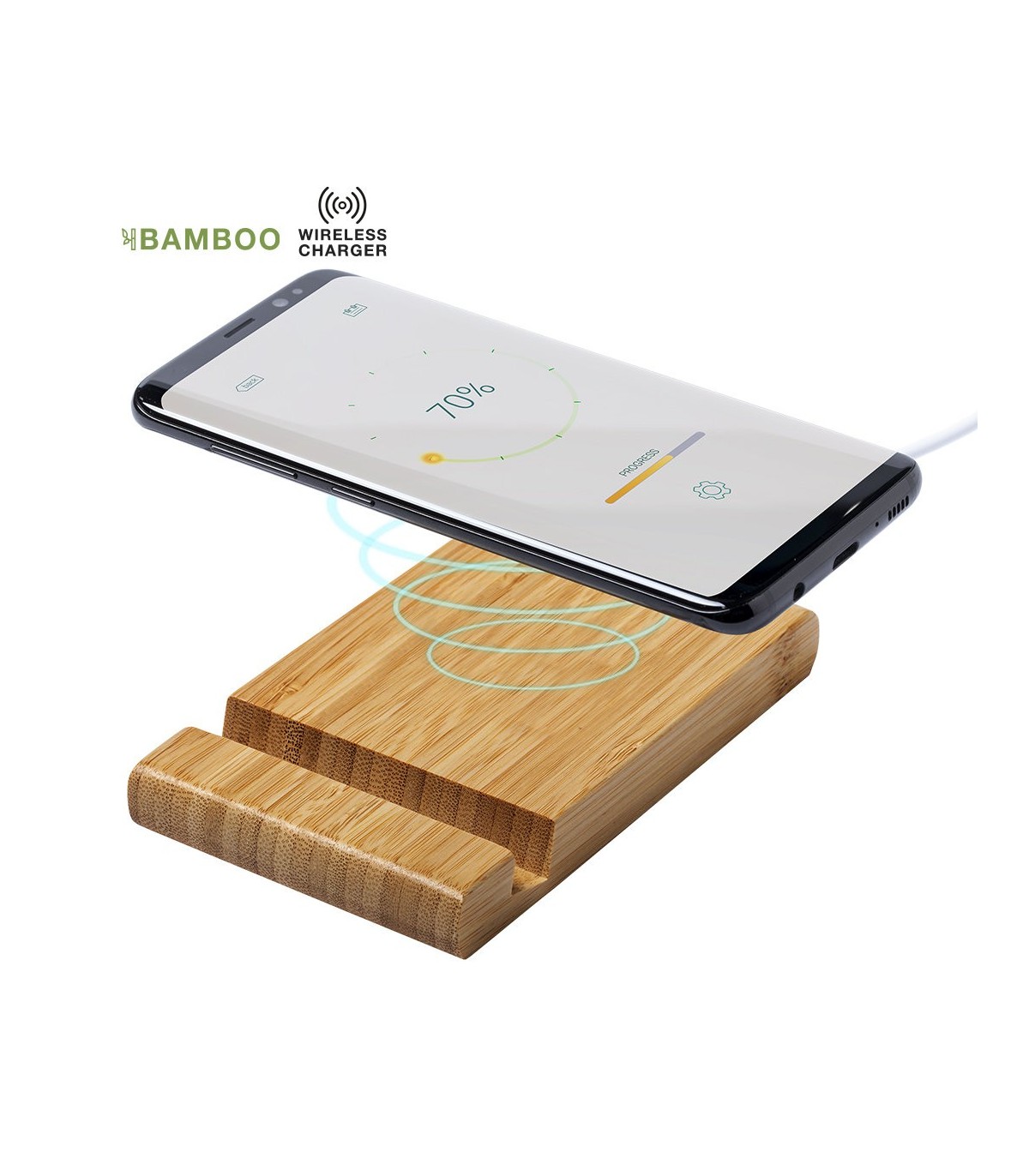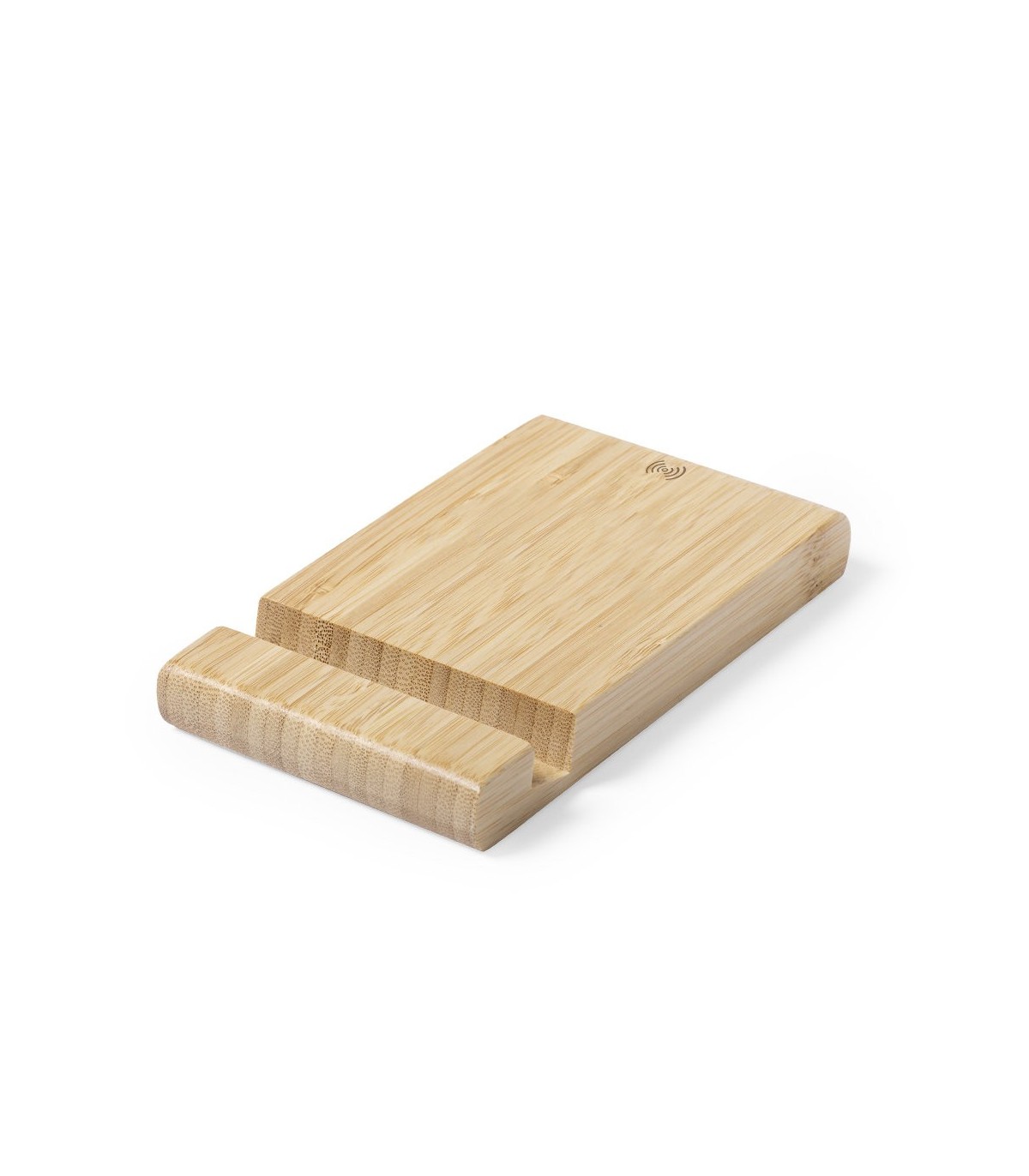 Cargador inalámbrico 5W de línea ecológica, con soporte integrado para smartphones y tablets. Carcasa en bambú procedente de cortes naturales. Incluye cable micro USB de 1m y es compatible con dispositivos equipados con tecnología de carga inalámbrica. Con amplia superficie de marcaje, presentado en atractiva caja de diseño eco.