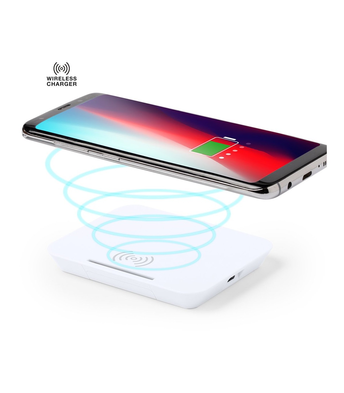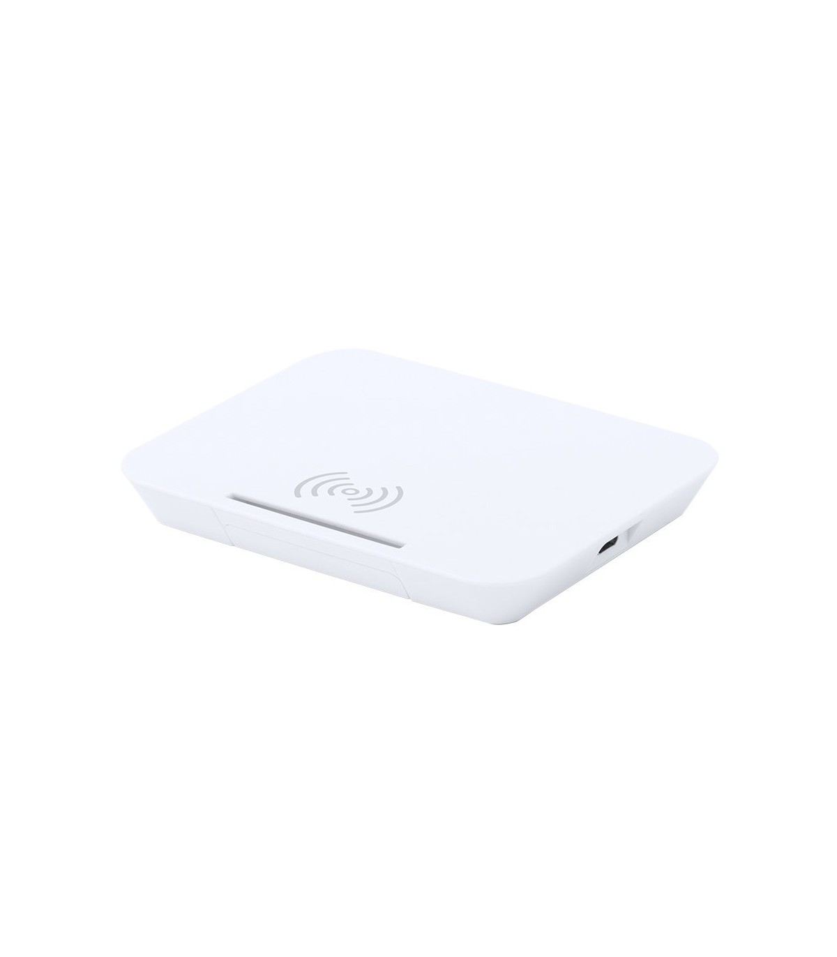 Cargador inalámbrico con función soporte de smartphone. De sobrio diseño monocolor en blanco, con cable de carga micro USB incluido. Compatible con dispositivos equipados con tecnología de carga inalámbrica. Presentado en atractiva caja de diseño.