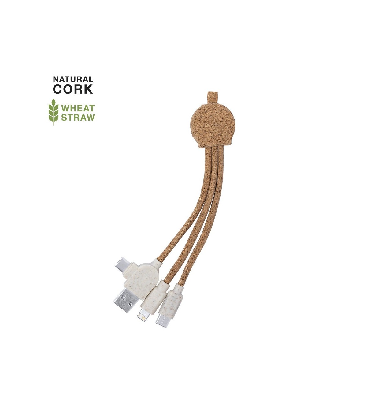 Cable cargador USB de línea ecológica, fabricado en corcho natural y con accesorios en caña de trigo, para así fomentar la utilización de materias primas naturales y reducir las emisiones contaminantes. Con conexiones USB, tipo C (entrada y salida) y dual micro USB-Lightning. Con accesorio para colgar y zona lisa para marcaje. Presentado en bolsa individual autocierre de diseño eco.
