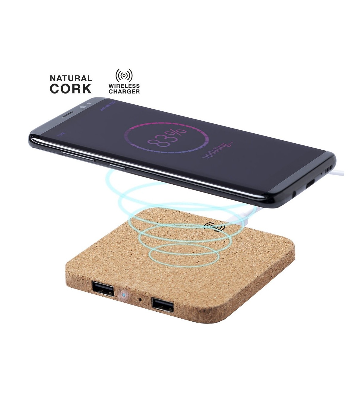 Cargador inalámbrico 5W de línea ecológica. Carcasa en corcho natural, con indicador de estado de carga y salida USB dual de 2.100 mA de capacidad para carga simultánea de hasta 3 dispositivos (1 por carga inalámbrica y 2 por cable). Incluye cable micro USB de 1 metro de largo, con base antideslizante en terciopelo y compatible con dispositivos equipados con tecnología de carga inalámbrica. Presentado en atractiva caja de diseño eco.