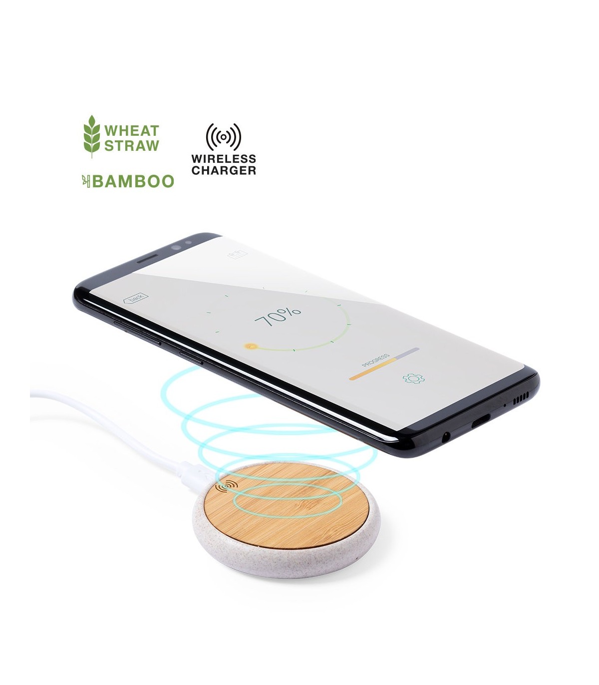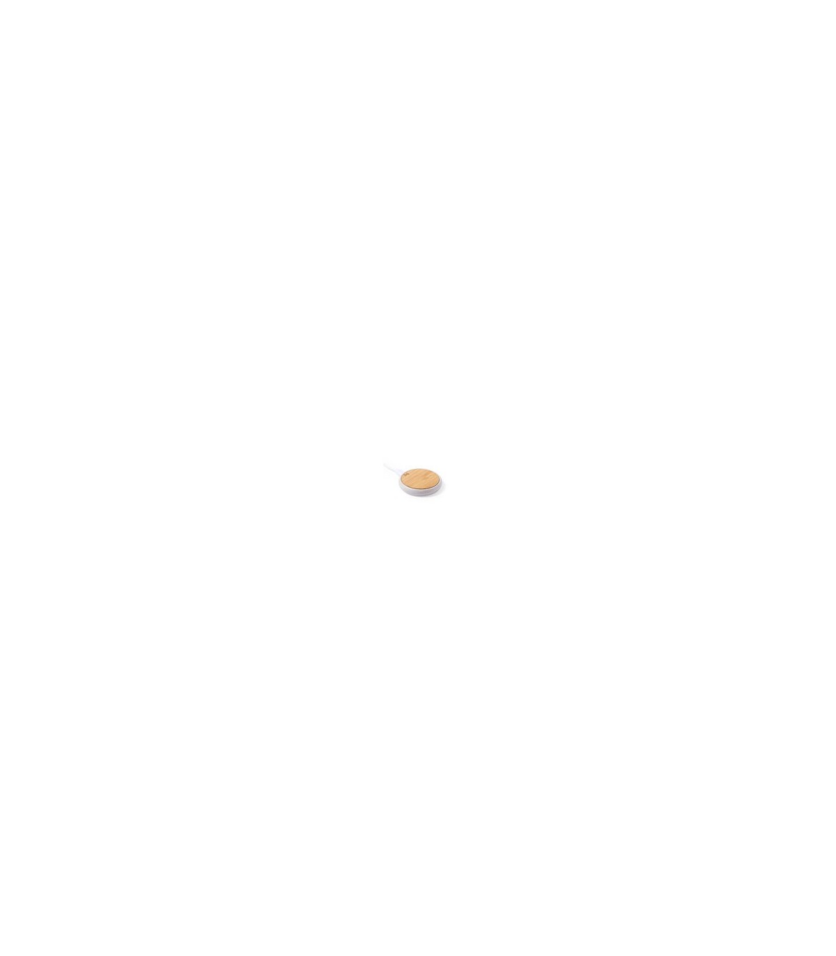 Cargadores inalámbricos circulares con superficie de carga en bambú. Indicador led, con cable de carga micro USB. Protección de seguridad para evitar sobrecalentamiento.