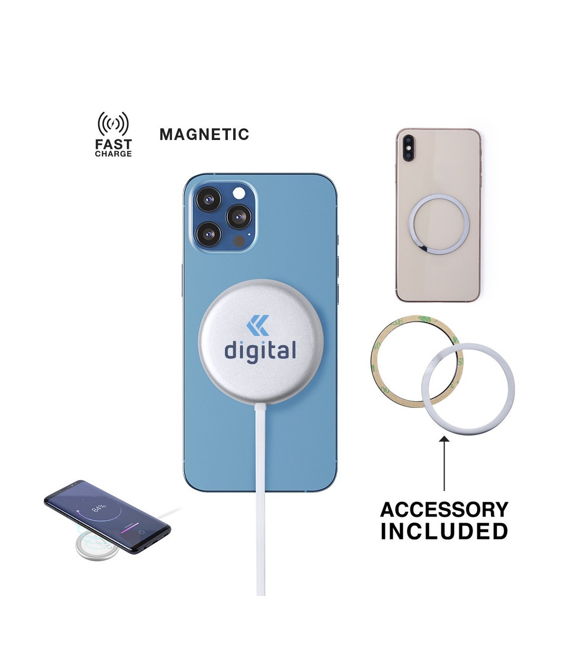 Cargador inalámbrico magnético 10W. Carcasa fabricada en resistente aluminio de acabado plateado. Con indicador de estado de carga y cable USB de 1m con conector de aluminio. Incluye accesorio metálico con adhesivo 3M, de fijación extra fuerte y libre de residuo al despegarlo del dispositivo, permitiendo así el uso de la función magnética del cargador en cualquier dispositivo móvil. Compatible con terminales equipados con tecnología de carga inalámbrica. Amplia superficie de marcaje y presentado en atractiva caja de diseño. Disponible manual de instrucciones en español e inglés.