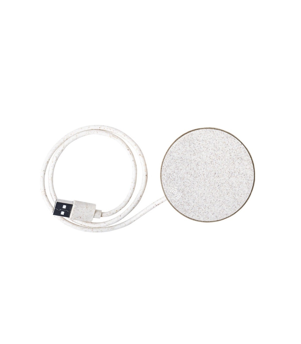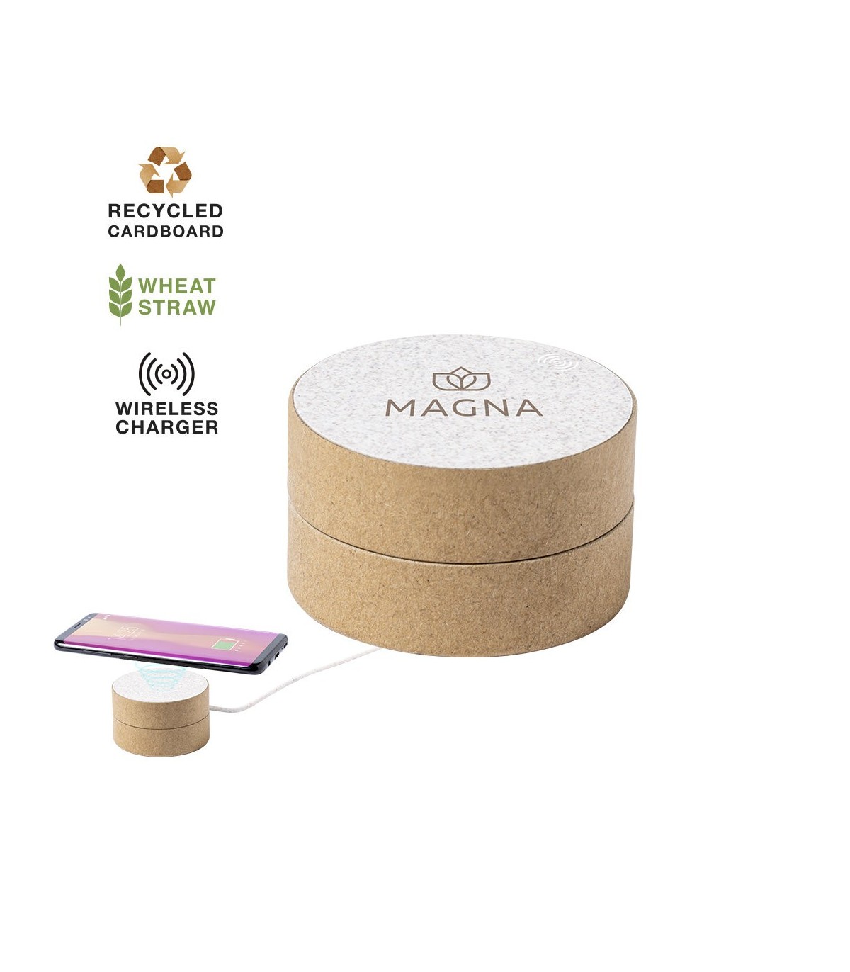 Original cargador inalámbrico circular de línea ecológica. Carcasa en cartón reciclado, contribuyendo a la conservación de los bosques y reduciendo considerablemente la huella de carbono, con superficie de carga y cable en caña de trigo. Compartimento interior para guardar el cable y poder llevarlo a cualquier lado. Indicador LED de estado de carga, compatible con smartphones con tecnología de carga inalámbrica y presentado en atractiva caja de diseño eco, con manual de instrucciones en español e inglés.
