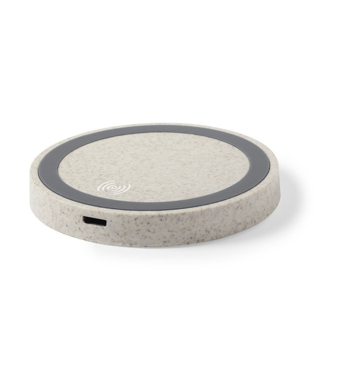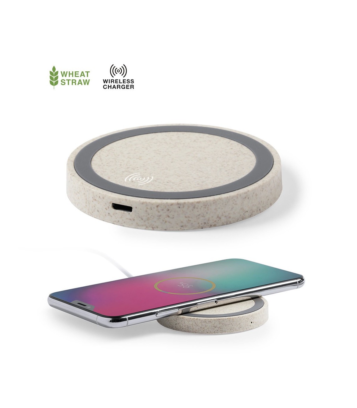 Cargador inalámbrico circular de línea ecológica. Carcasa en caña de trigo, para así fomentar la utilización de materias primas naturales y reducir las emisiones contaminantes. Con base antideslizante e indicador LED de estado de carga. Compatible con smartphones con tecnología de carga inalámbrica y presentado en atractiva caja de diseño eco.
