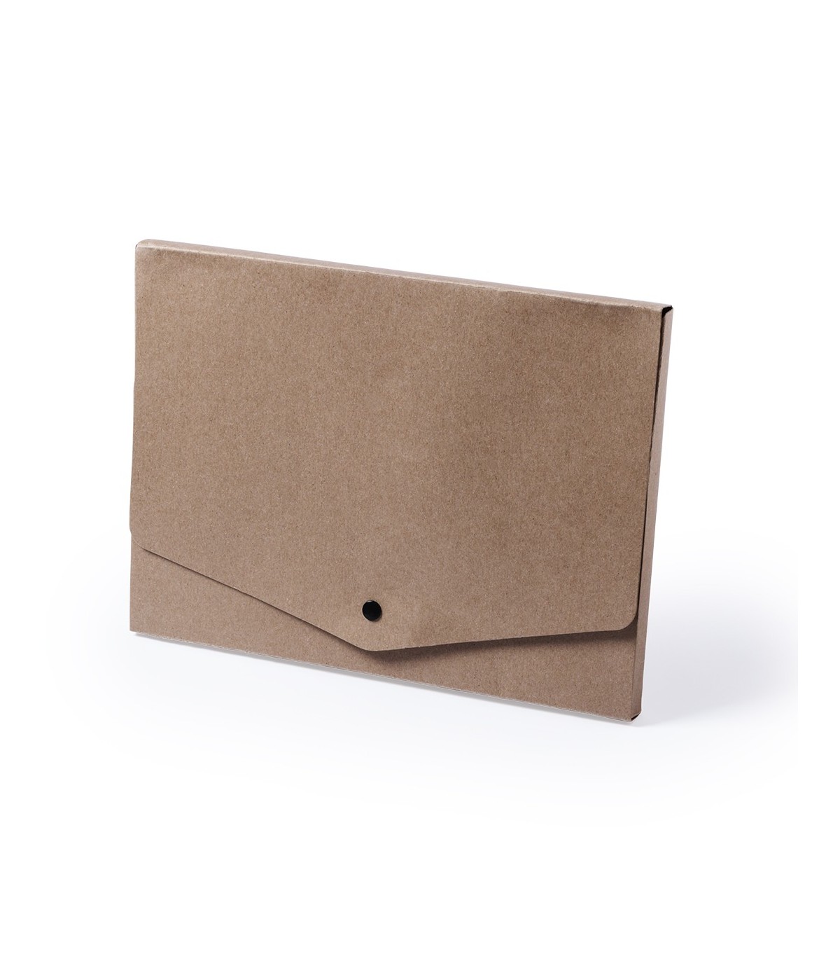 Portadocumentos en resistente cartón reciclado de acabado rígido con cierre de corchete en solapa, ideales para regalos promocionales de empresa.