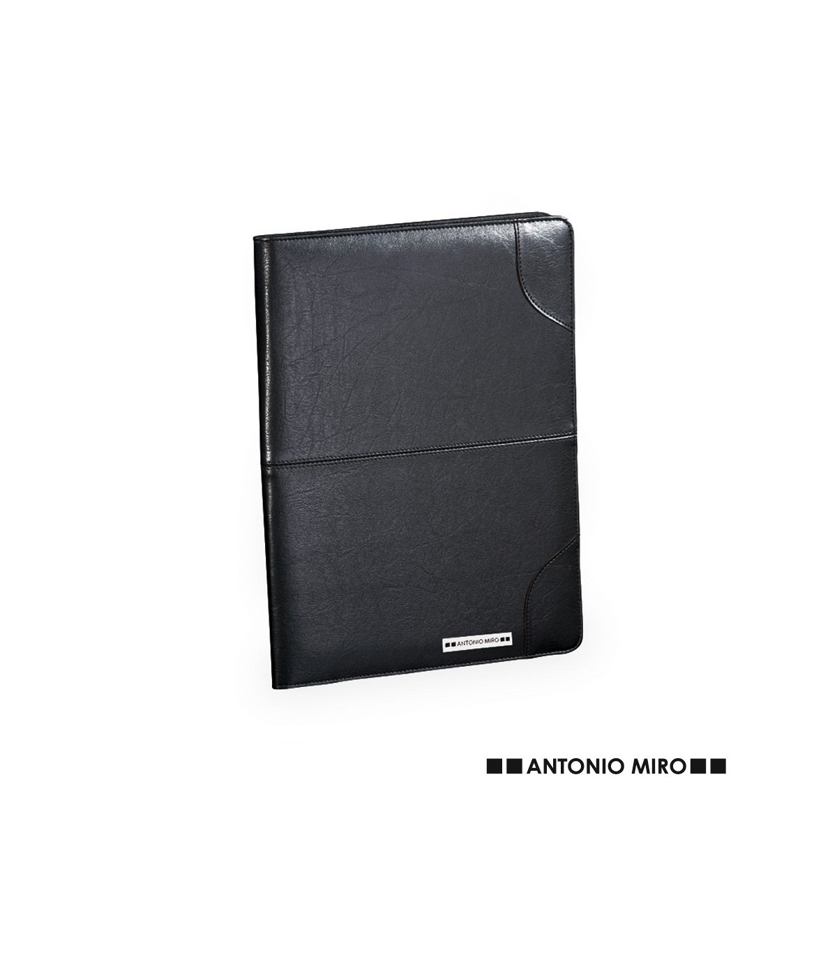 Carpeta de Antonio Miró en elegante y suave polipiel de acabado brillante. Interior con bolsillo de solapa, tarjeteros y bloc de notas de 20 hojas con distribución a una raya. Chapa frontal metálica con logotipo de la marca.