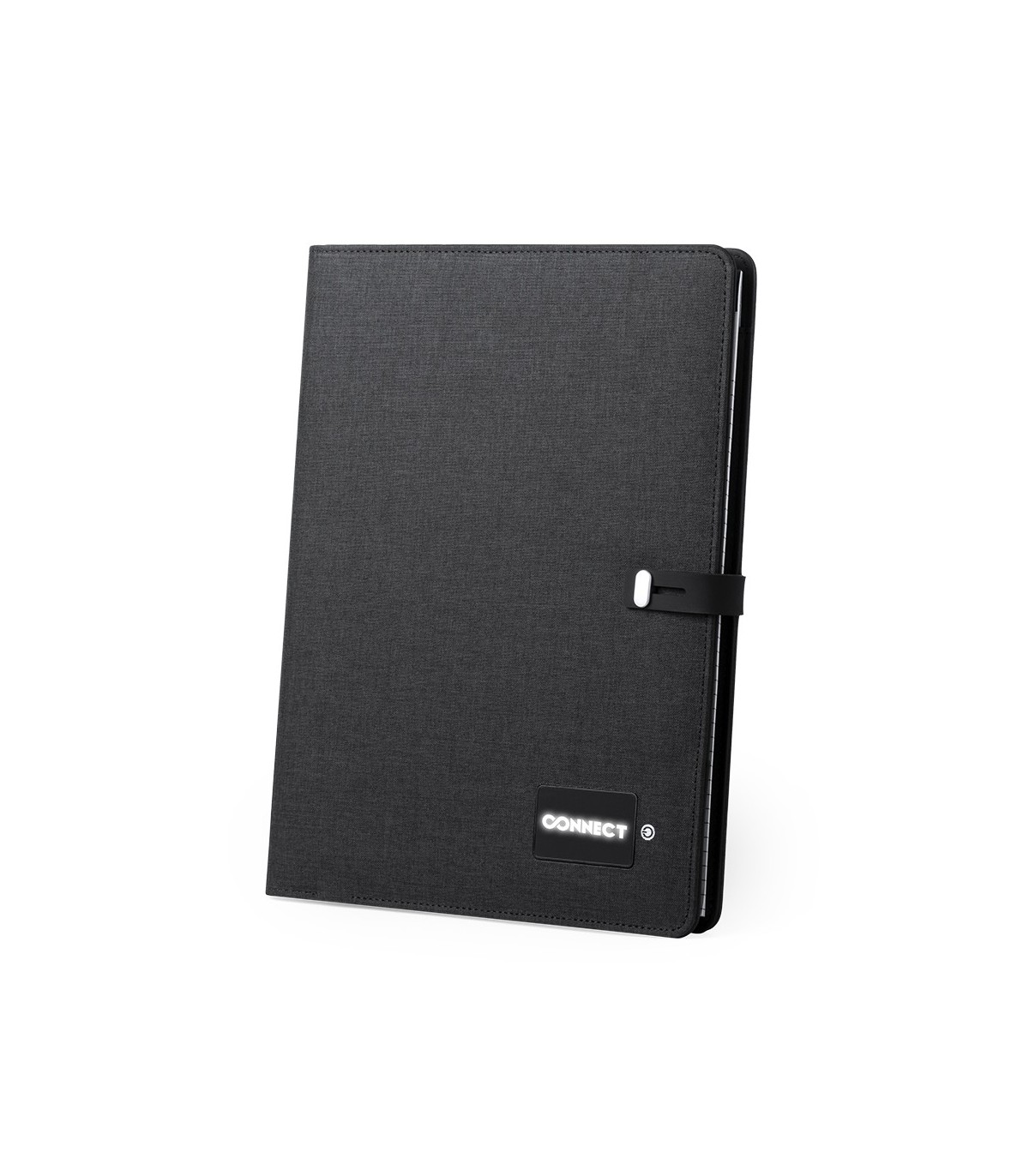 Carpetas exclusivas con batería auxiliar externa de carga -4.000 mAh- compartimentos para tarjetas de visita, memorias USB, cargador inalámbrico para smartphone.