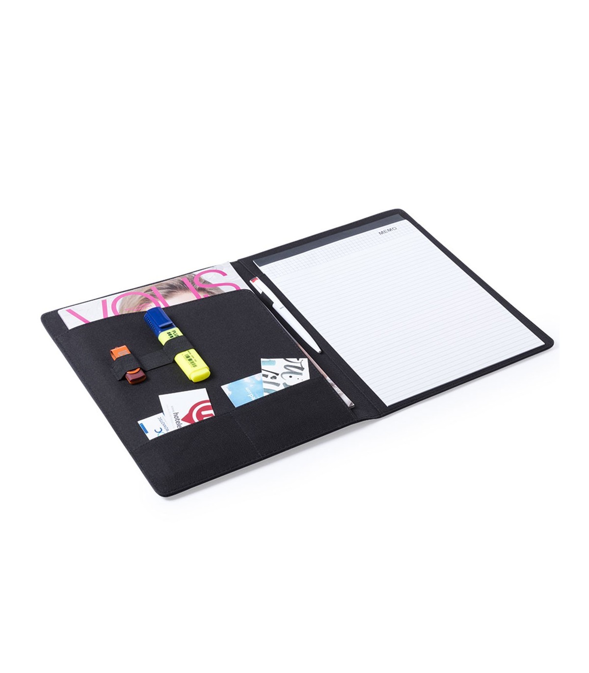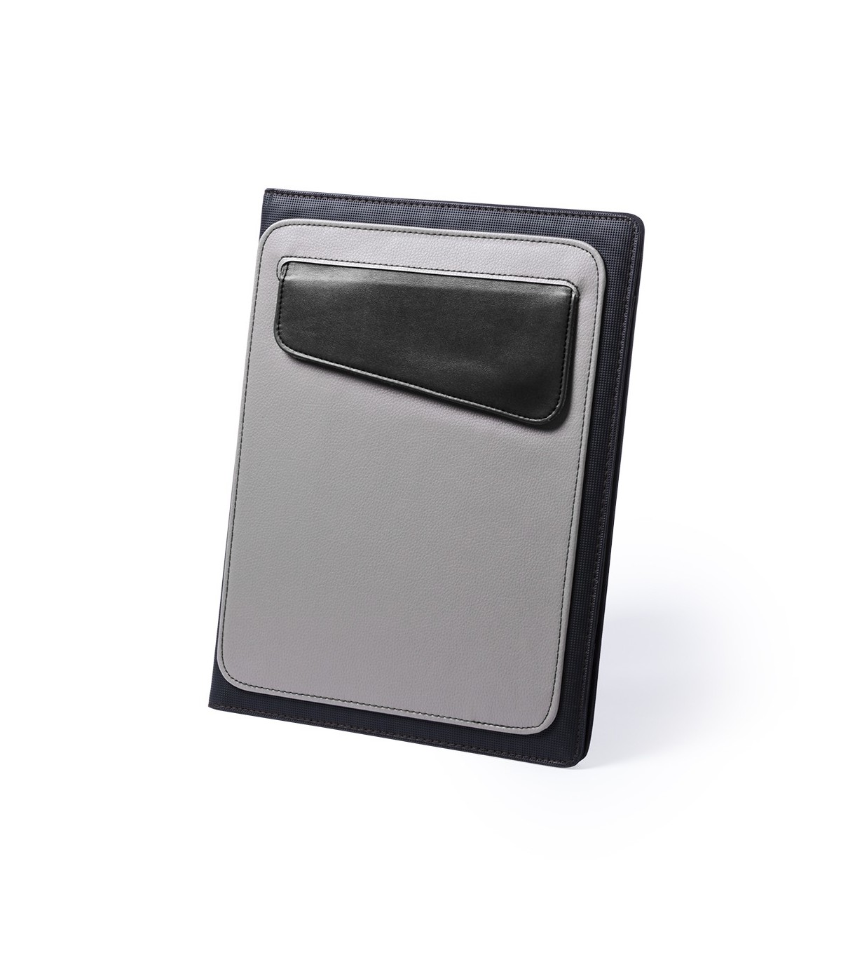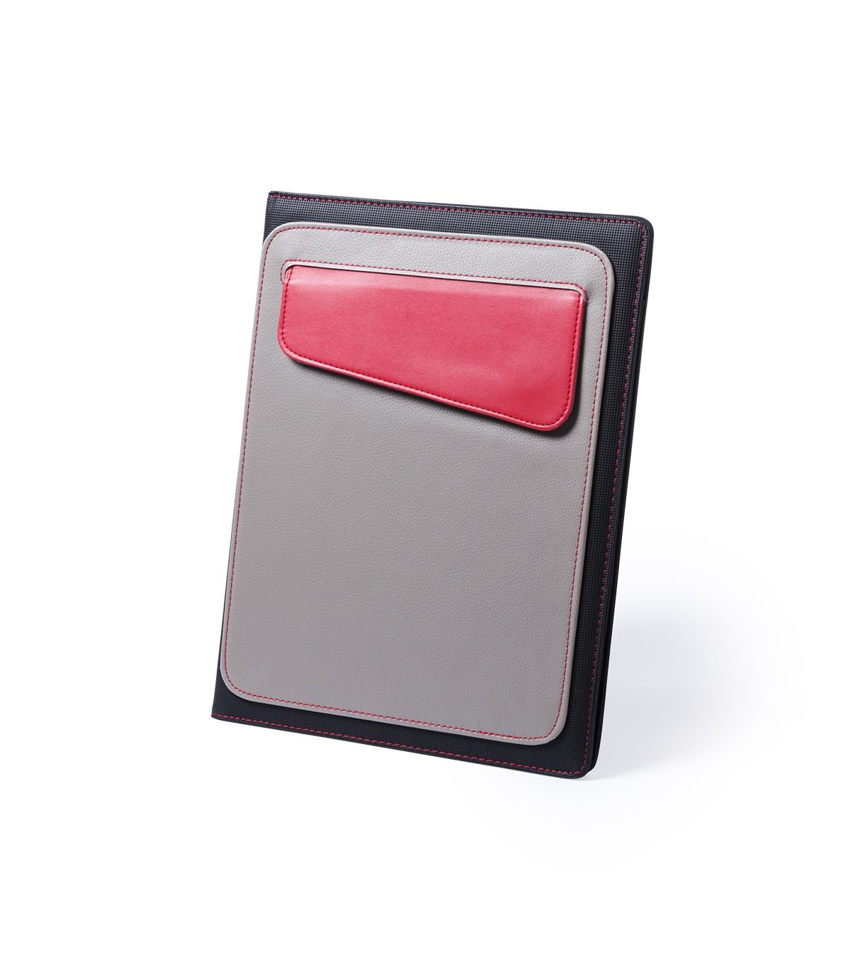 Funda carpeta de acabado en original combinación de polipiel y poliéster 300D. Compartimento interior para tablets de hasta 10 pulgadas. Con funda en parte frontal con original solapa de color y costuras a juego. Interior con bloc de notas de 20 hojas con distribución a una raya, soportes para bolígrafo, tarjeteros y bolsillo con solapa.