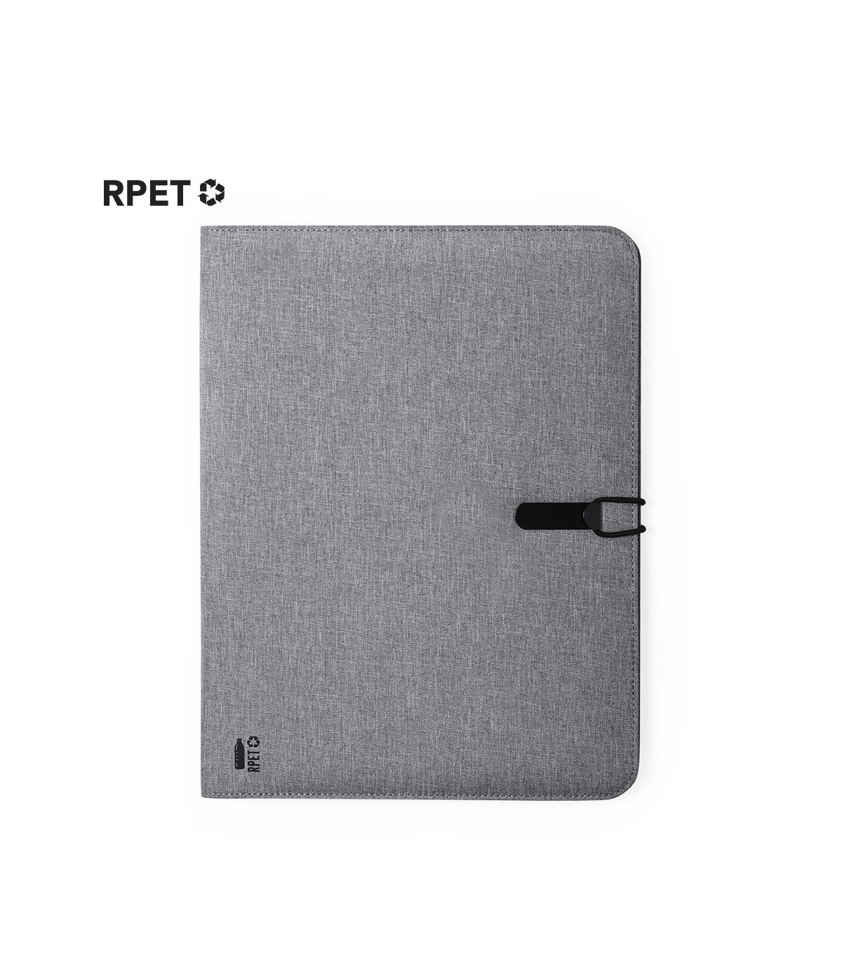 Elegante carpeta de línea ecológica tamaño A4. Fabricada en resistente 600D RPET efecto melange, elaborado a partir de plástico reciclado para así fomentar la reutilización de residuos plásticos y contribuir a la sostenibilidad del planeta. Detalles en negro y cierre metálico con cinta elástica especialmente diseñado para marcaje en láser. Interior con bloc extraíble de 20 hojas con disposición a una raya, 3 bolsillos de solapa, tarjeteros y soporte para bolígrafo. Distintivo RPET en esquina.