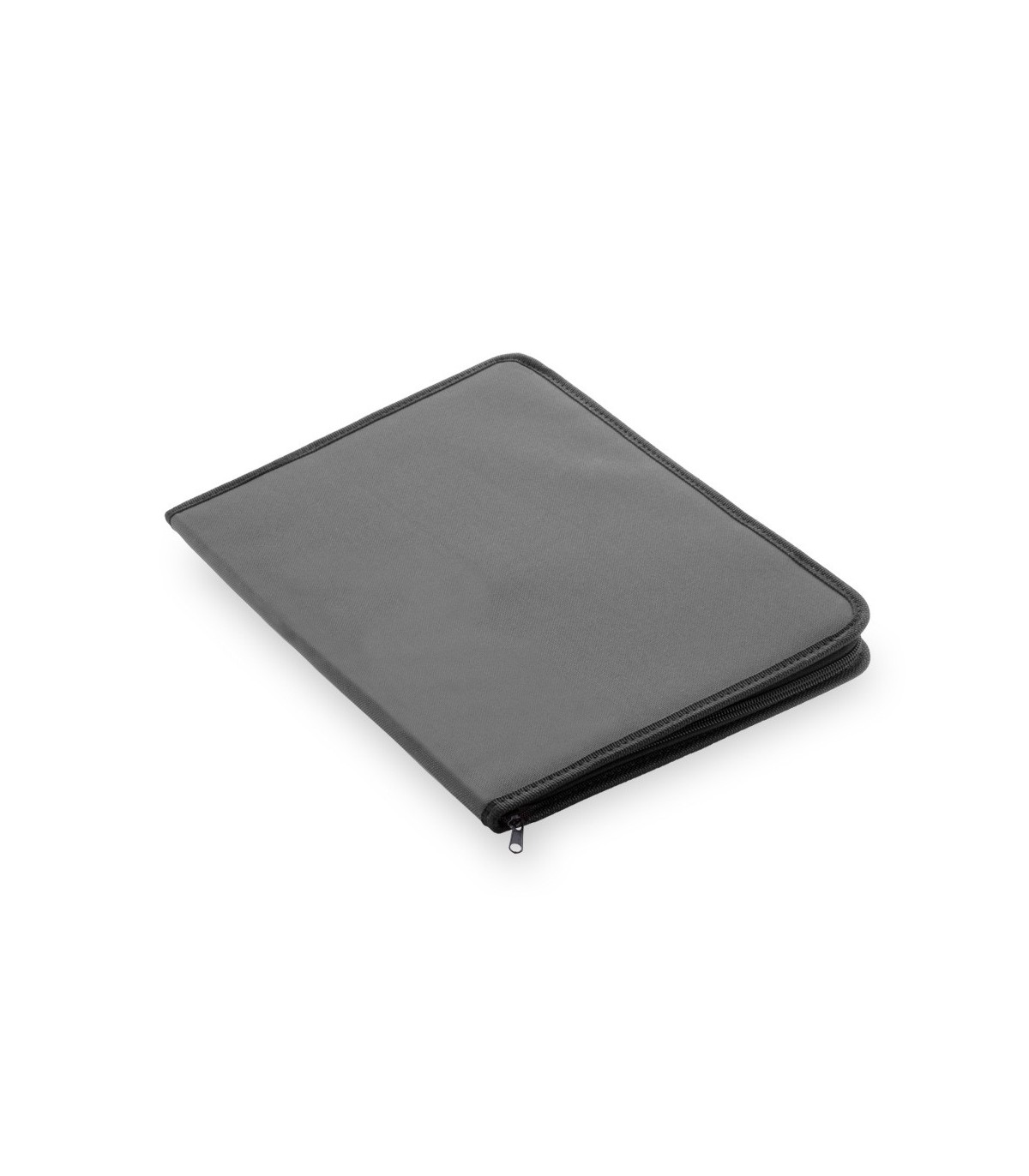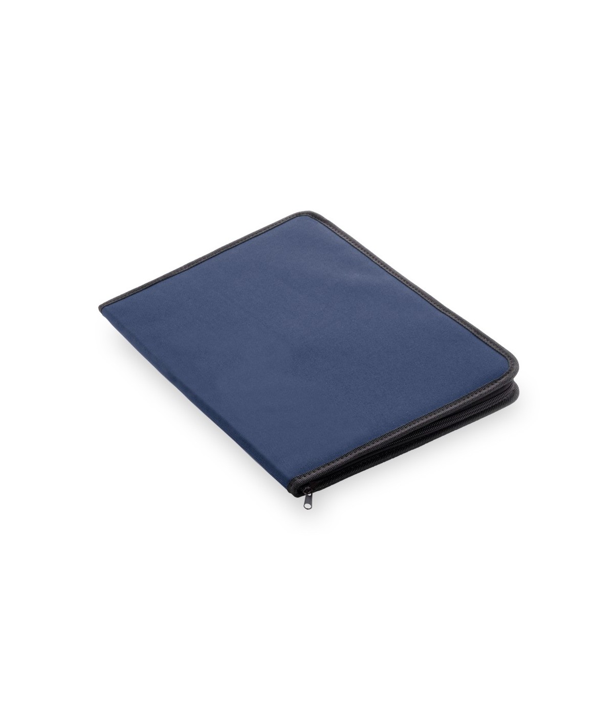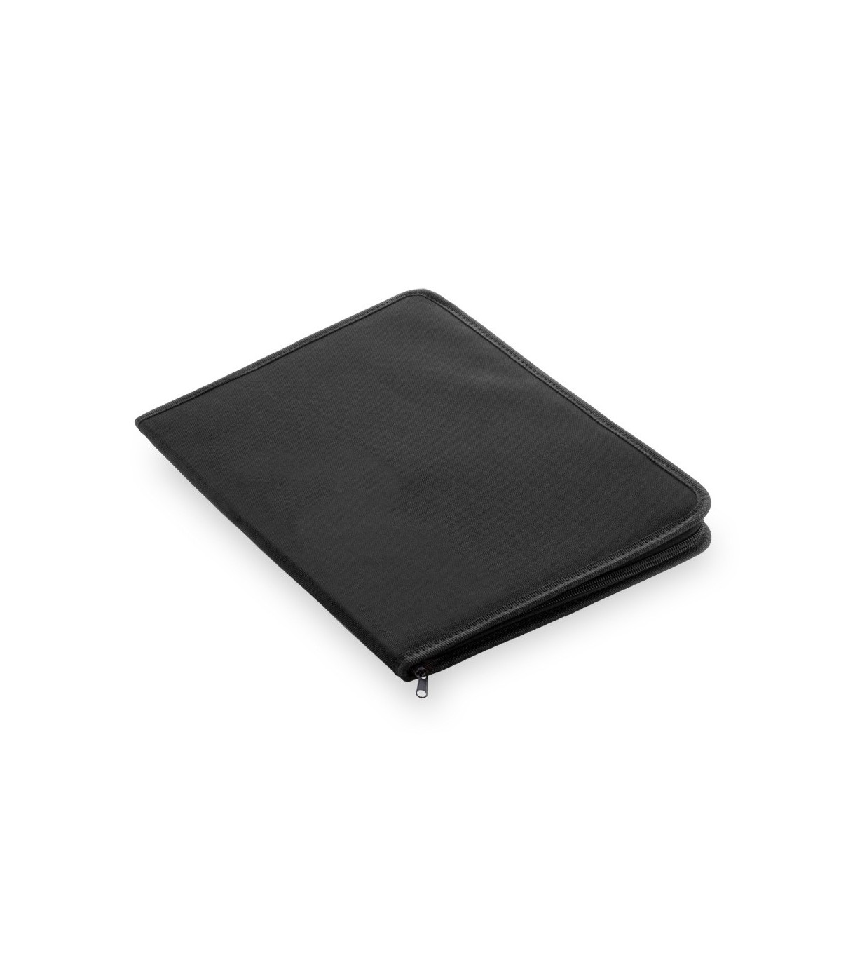Carpeta con cierre de cremallera en variados colores acabada en resistente poliéster 600D con ribete reforzado en negro. Interior con bloc extraíble de 20 hojas lisas, 2 bolsillos de solapa y soporte para bolígrafo.