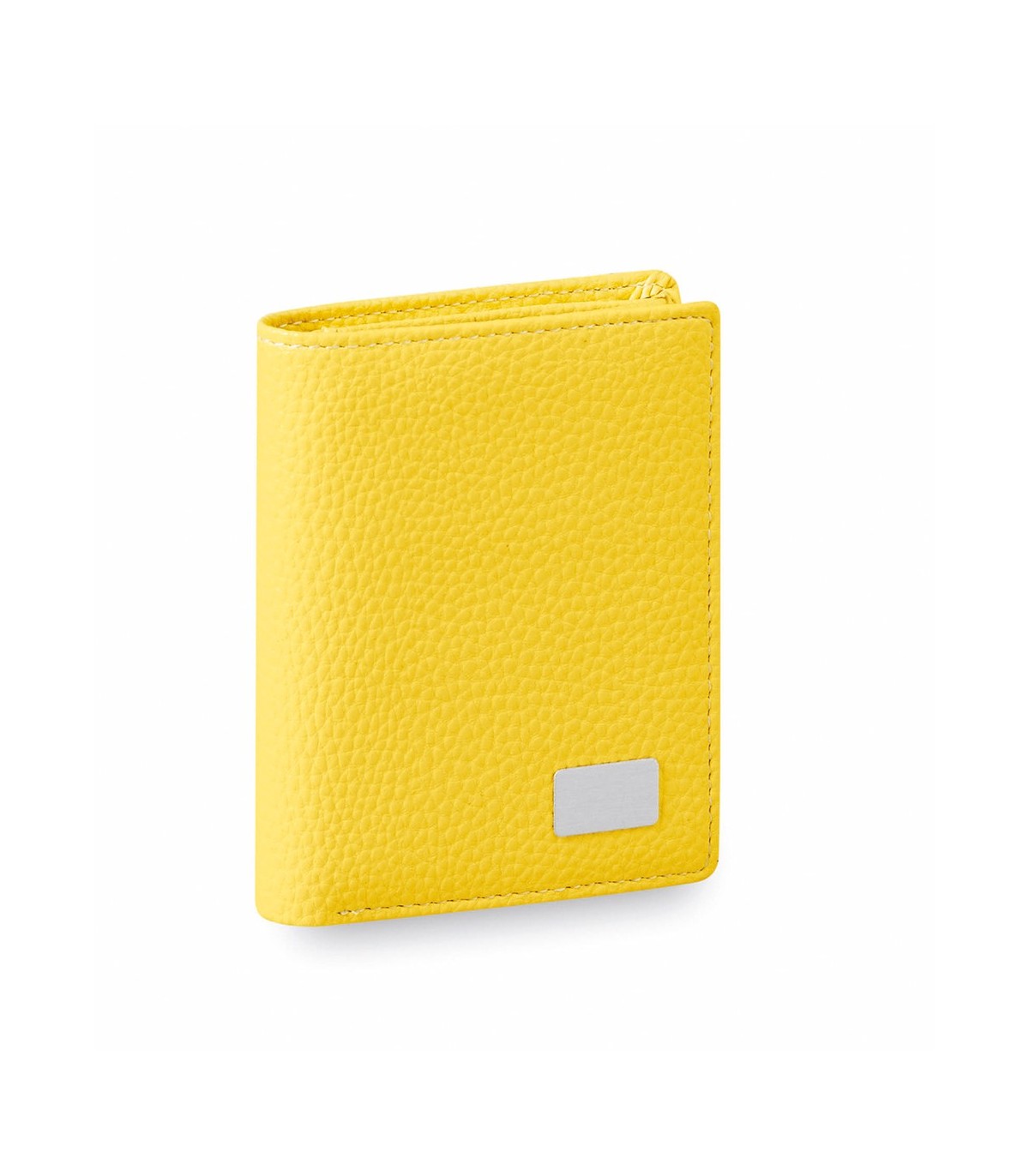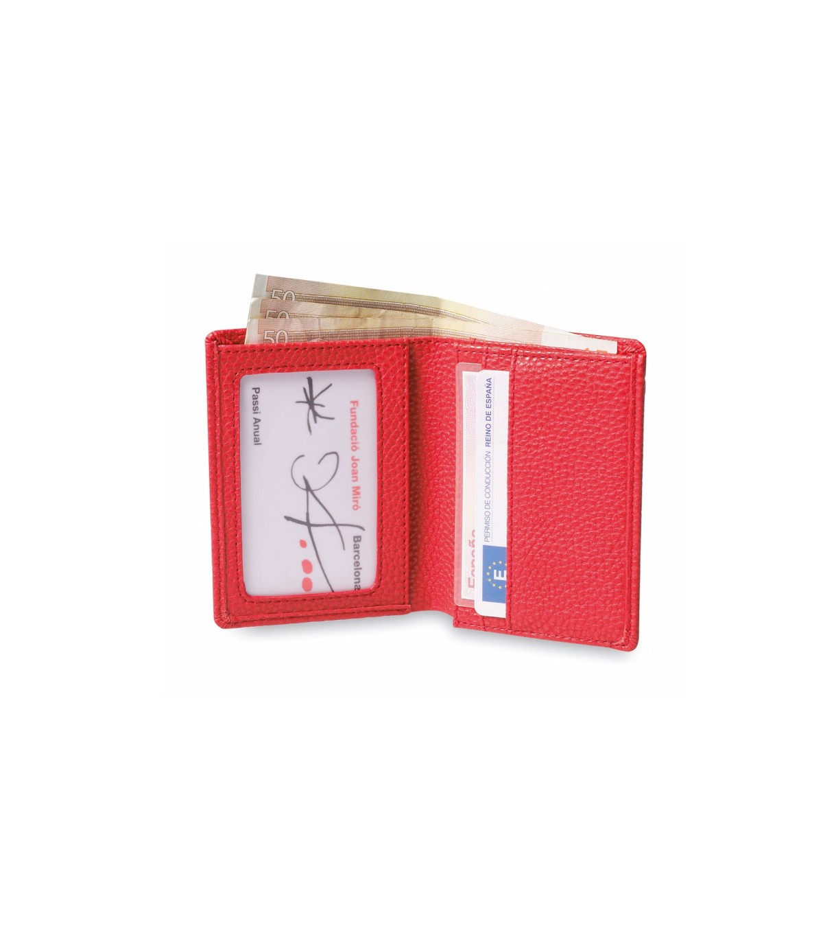 Cartera con cuerpo en suave acabado de elegante polipiel brillante en variada gama de colores. Interior con billetero, compartimento transparente para documentación y 4 compartimentos para tarjetas. Con chapa metálica exterior para marcaje en láser.