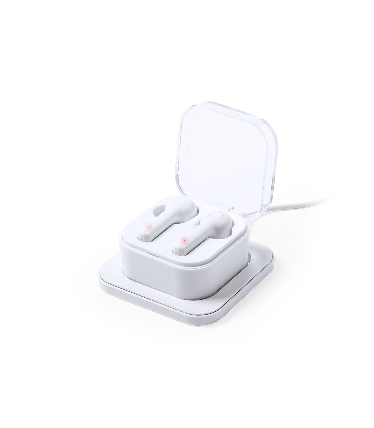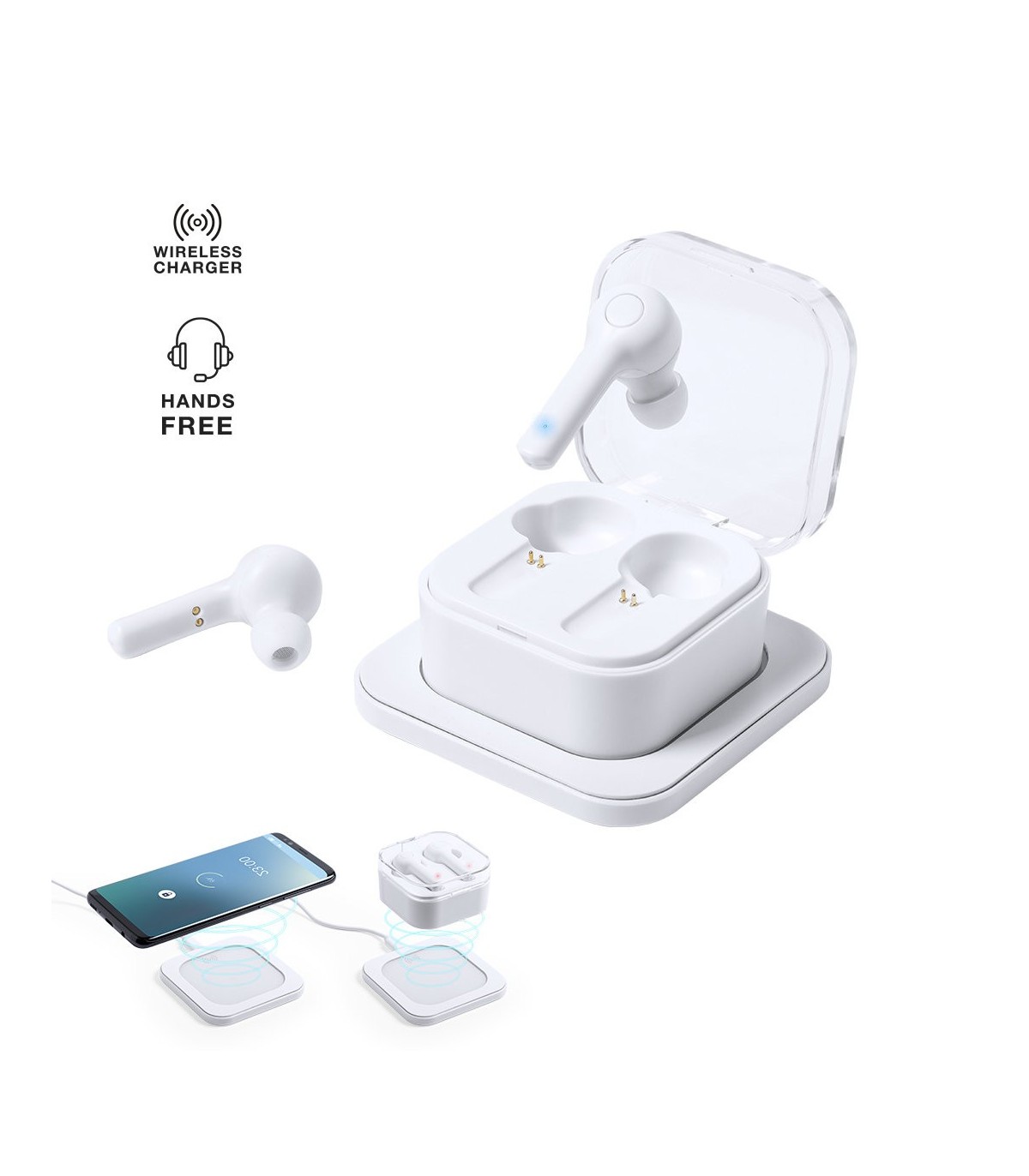 Auriculares intraurales Bluetooth® 5.0 con base de carga inalámbrica 5w, Compatible con dispositivos equipados con tecnología de carga inalámbrica. En elegante acabado de color blanco y de diseño ergonómico. Incluyen botón de control integrado en el auricular y cuentan con batería de litio. Base de carga a juego y luz LED de estado de carga. Función manos libres y recargables, con cable de carga incluido. Presentados en estuche individual de lujo con tapa de bisagra y en atractiva caja individual de diseño.