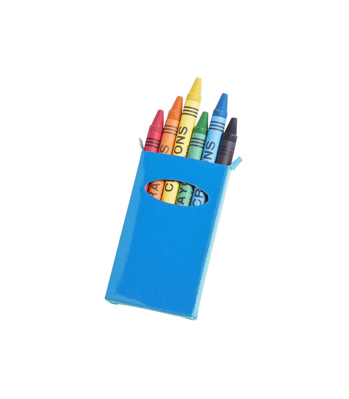Set de 6 ceras en caja de cartón con acabado brillante en llamativos colores y ventana. Con cuerpo cilíndrico en variados colores. En colores rojo, verde, amarillo, azul, negro, y naranja.