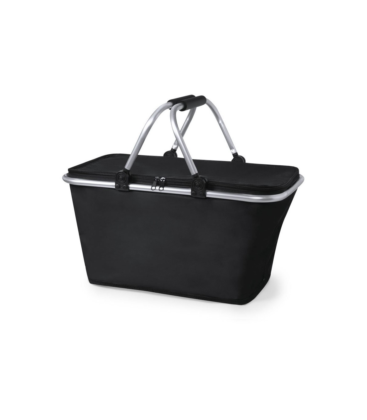 Cesta térmica de poliéster con interior de aluminio libre de BPA. Cierre de cremallera, con estructura de aluminio plegable y asas con EVA, de hasta 15 kilos de resistencia.