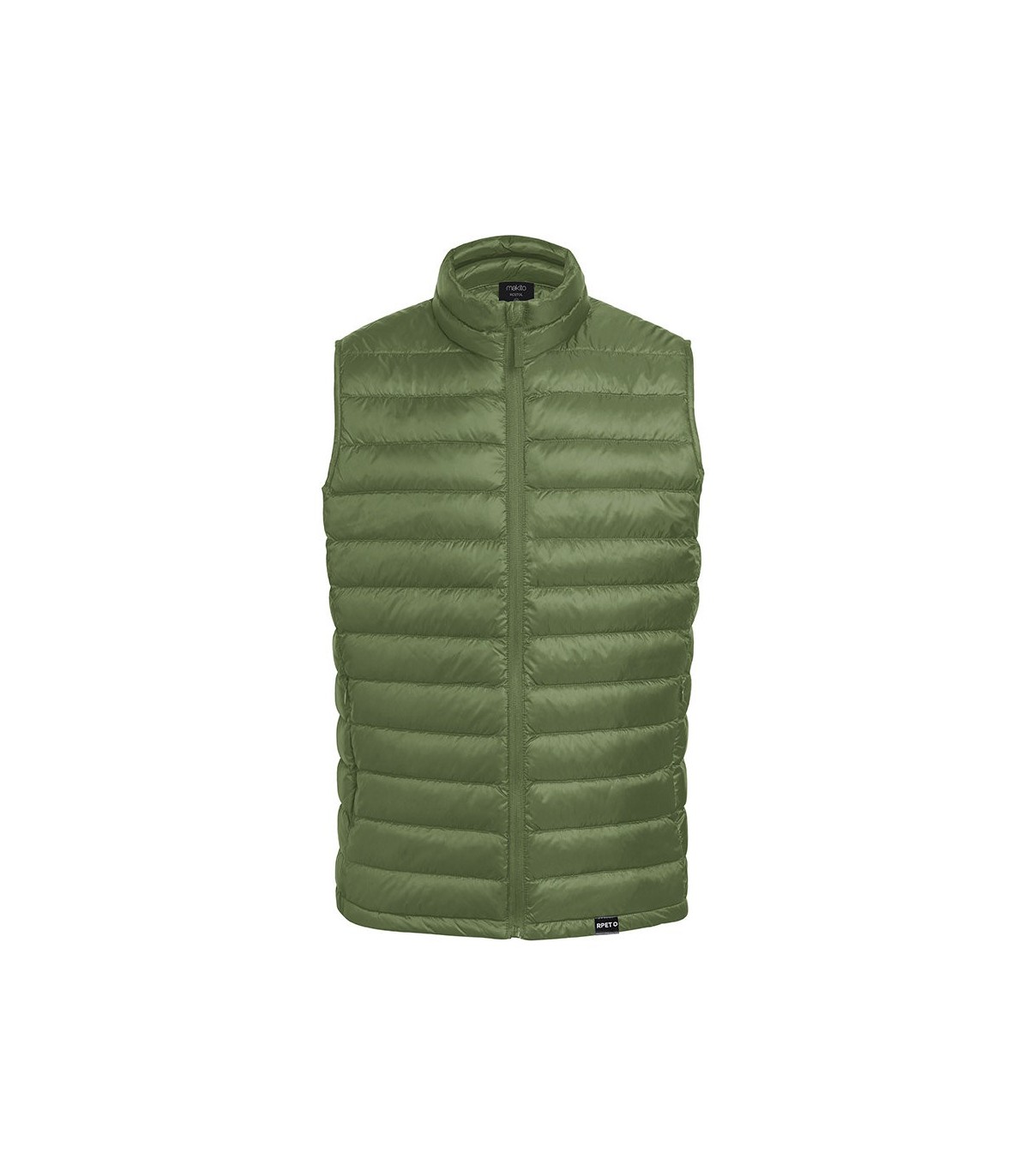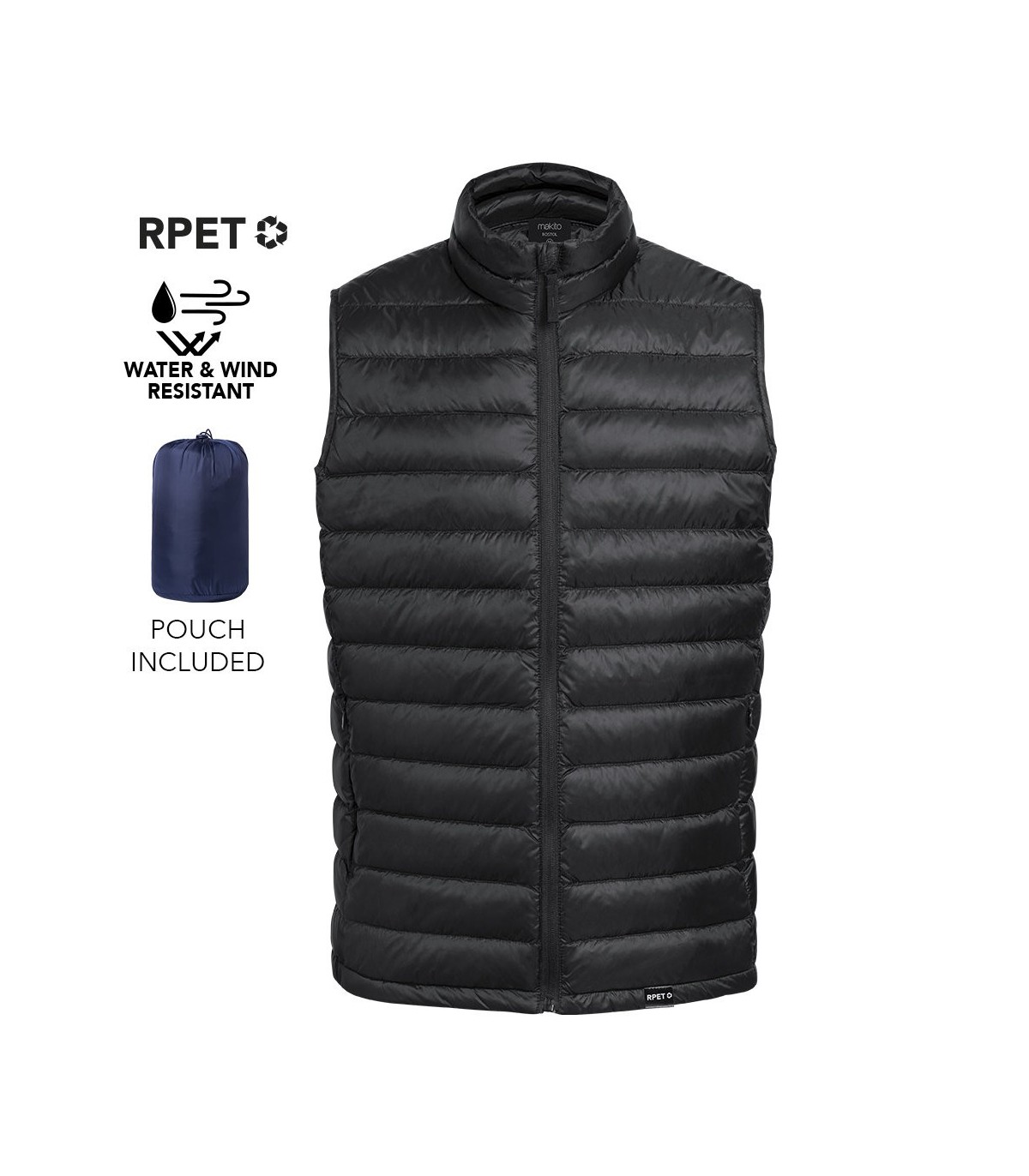 Chaleco unisex en cálido y suave material 100% poliéster RPET, elaborado a partir de plástico reciclado para así fomentar la reutilización de residuos plásticos y contribuir a la sostenibilidad del planeta. En material extra ligero efecto pluma, resistente al agua y cortavientos, con acolchado interior. Cremallera de cuello con tapeta y cinta en tirador, amplios bolsillos laterales con cremallera. Distintivo RPET en etiqueta y disponible en diferentes colores para personalizar con tu logo o marca de empresa. Tallas S, M, L, XL, XXL.
