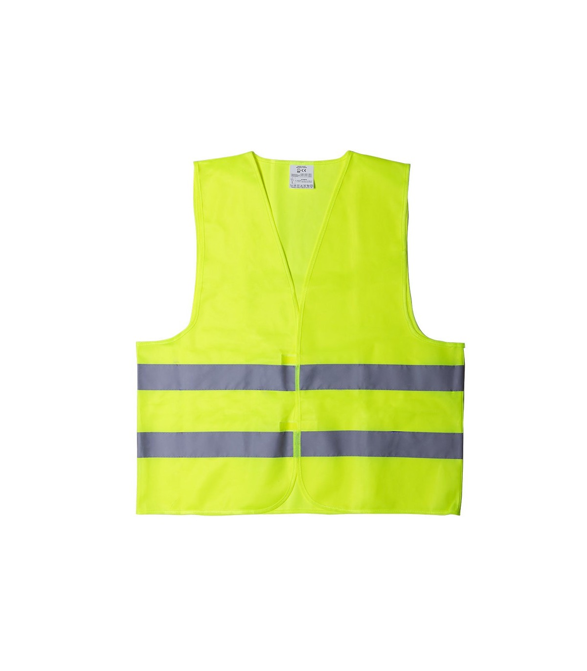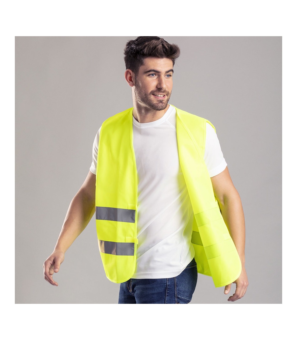 Chaleco reflectante de alta visibilidad, homologado según normativas de seguridad CE. Con doble tira reflectante alrededor del cuerpo y cierres de velcro. Talla única para adulto.