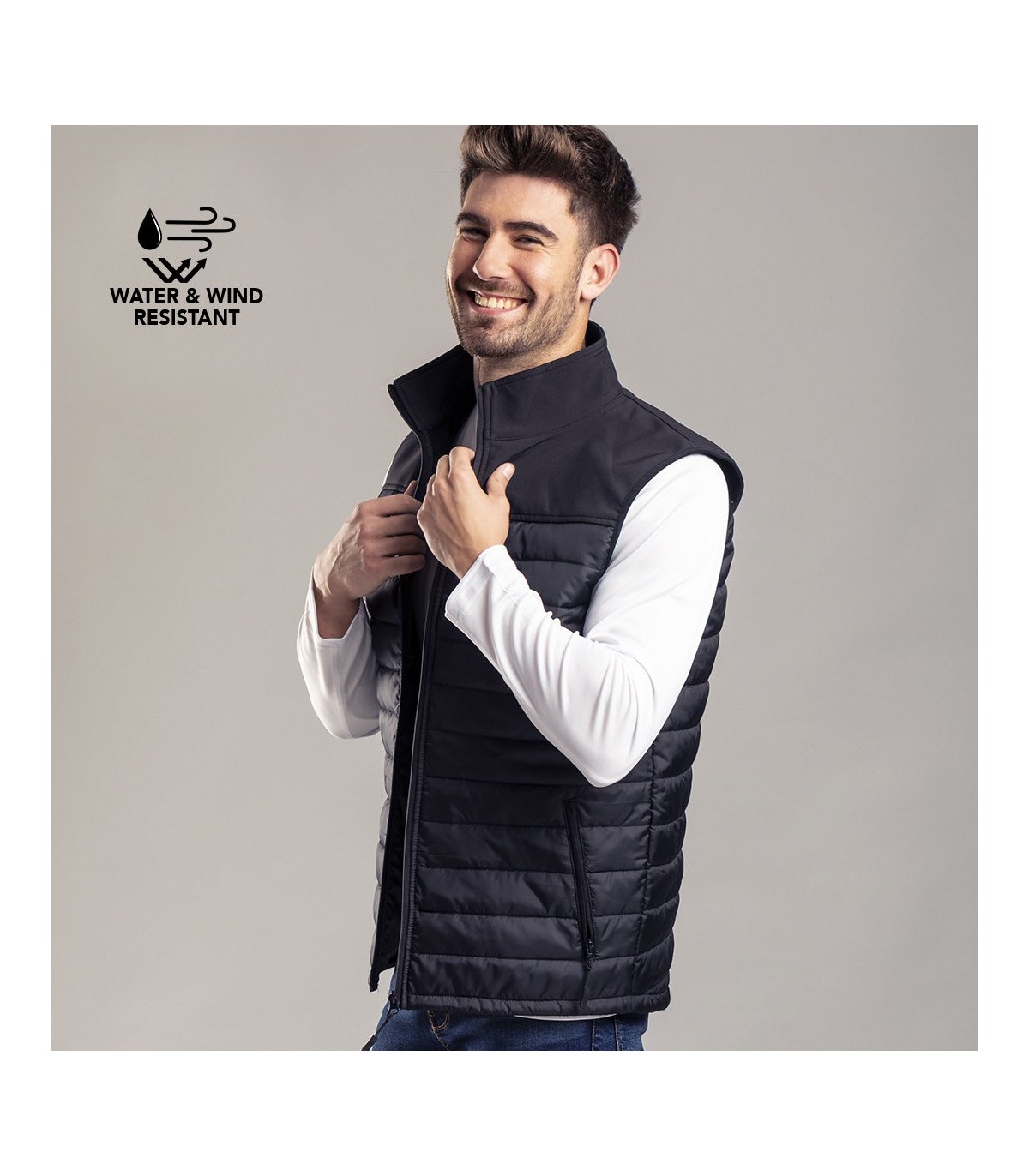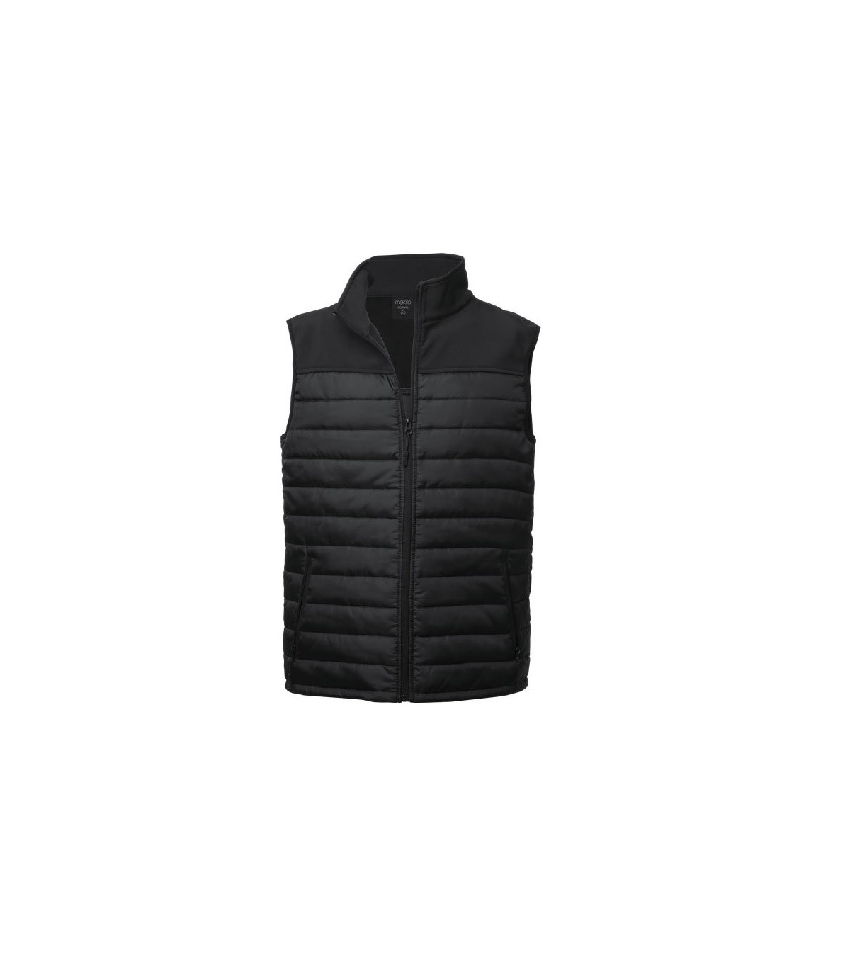 Chaleco impermeable y transpirable en combinación de materiales soft shell y poliéster. De elegante construcción en color negro, con cierre de cremallera y bolsillos laterales de cremallera con tiradores para fácil apertura. Disponible en tallas S, M, L, XL, XXL.