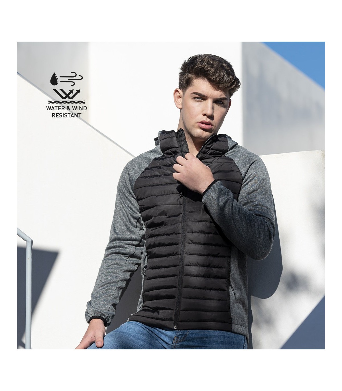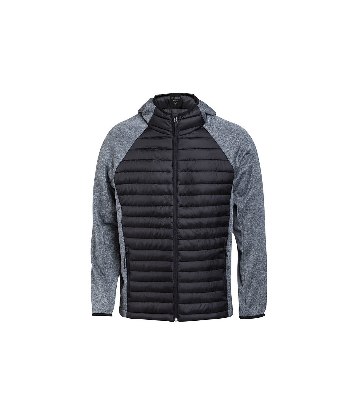 Chaqueta unisex transpirable en combinación de materiales soft shell y poliéster, con tejido acolchado tacto pluma en frontal y espalda. Capucha y manga estilo ranglán con ribete elástico en cuello, puños y bajo . De elegante construcción en combinación de colores negro y gris, resistente al viento y al agua. Cierre de cremallera y bolsillos laterales de cremallera con tiradores para fácil apertura. Disponible en tallas S, M, L, XL, XXL.