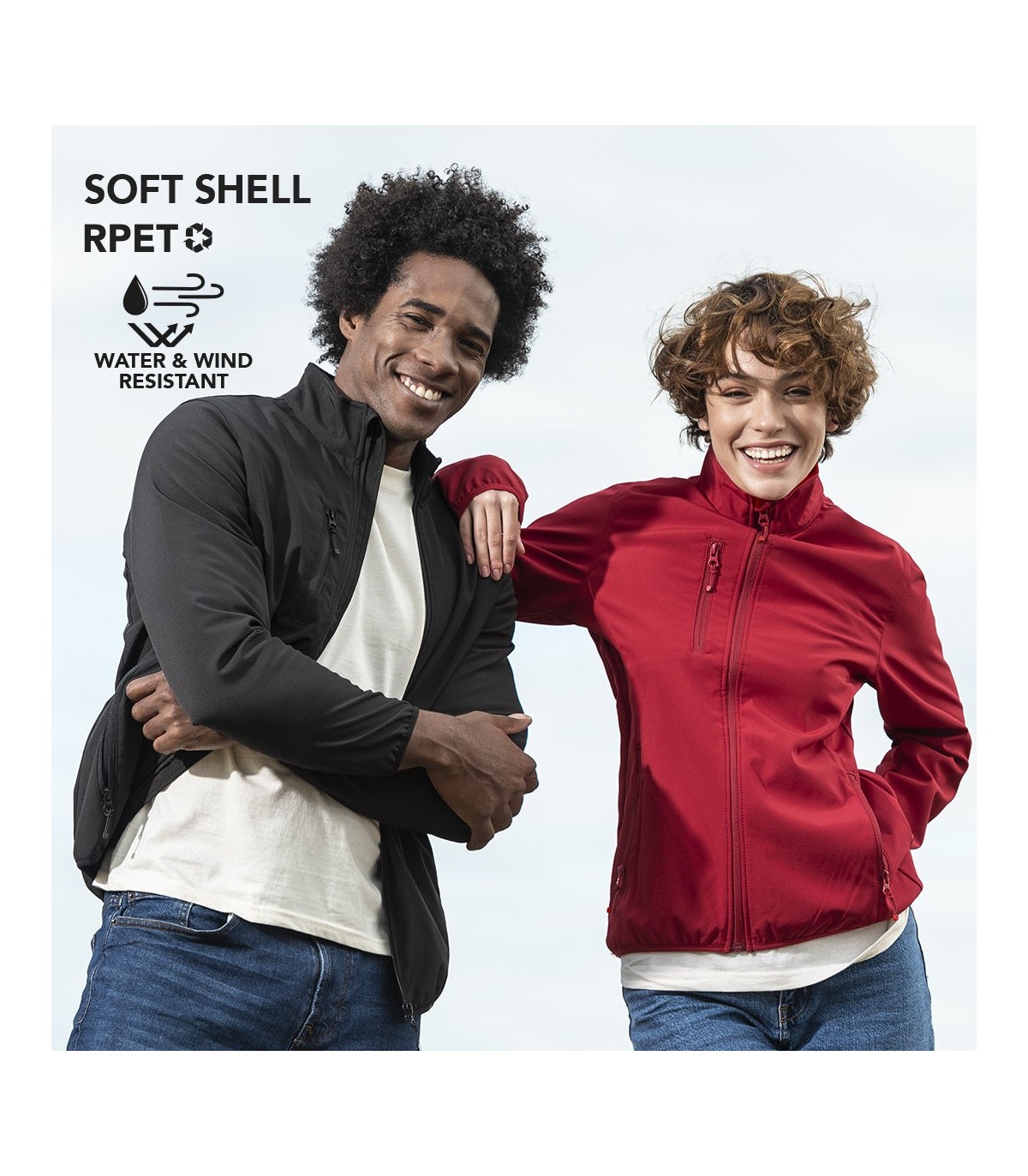 Chaqueta impermeable y transpirable en combinación de materiales RPET, elaborados a partir de plástico reciclado, para así fomentar la reutilización de residuos plásticos y contribuir a la sostenibilidad del planeta: exterior en soft shell y elastano de 300g/m2; con interior en 100% poliéster microfleece. Con distintivo eco en dobladillo inferior de la prenda.Resistente al viento y al agua, con cierre de cremallera y tiradores a juego. Incluye bolsillo frontal en pecho y laterales con cierre de cremallera invisible y tiradores a juego. Disponible en diferentes colores para personalizar y en tallas S, M, L, XL, XXL.