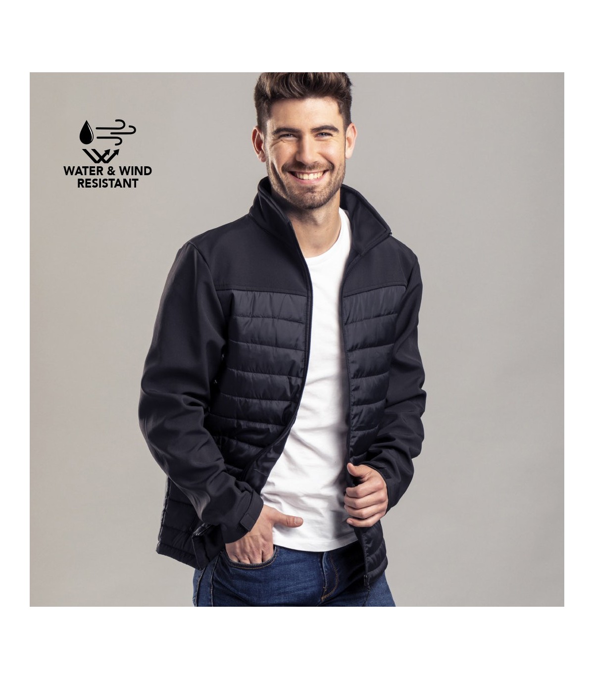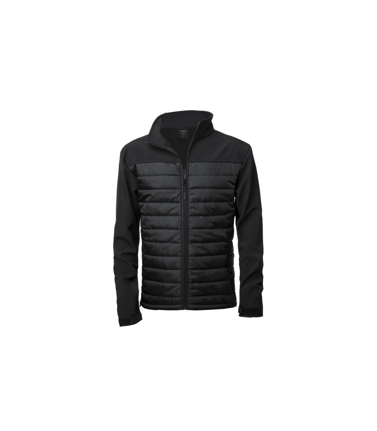 Chaqueta impermeable y transpirable en combinación de materiales soft shell y poliéster. De elegante construcción en color negro, con cierre de cremallera y bolsillos laterales de cremallera con tiradores para fácil apertura. Puños ajustables y disponible en tallas S, M, L, XL, XXL.