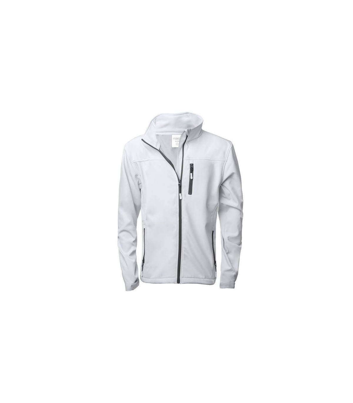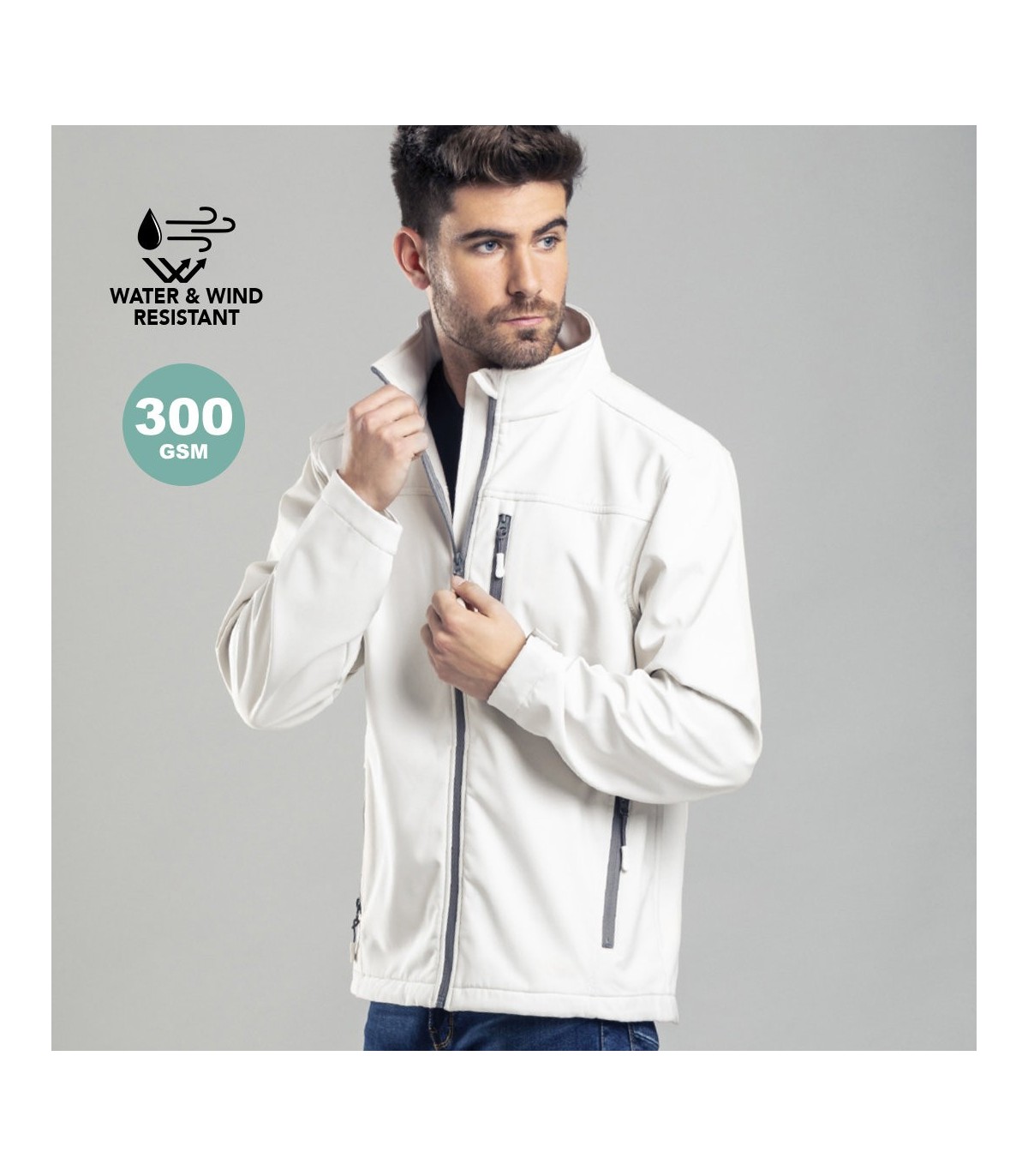 Chaqueta impermeable y transpirable en de soft shell de 300g/m². De elegante diseño bicolor, en color blanco con contraste de detalles en gris. Cierre de cremallera y bolsillos frontal y laterales de cremallera. Puños ajustables y disponible en tallas S, M, L, XL, XXL.
