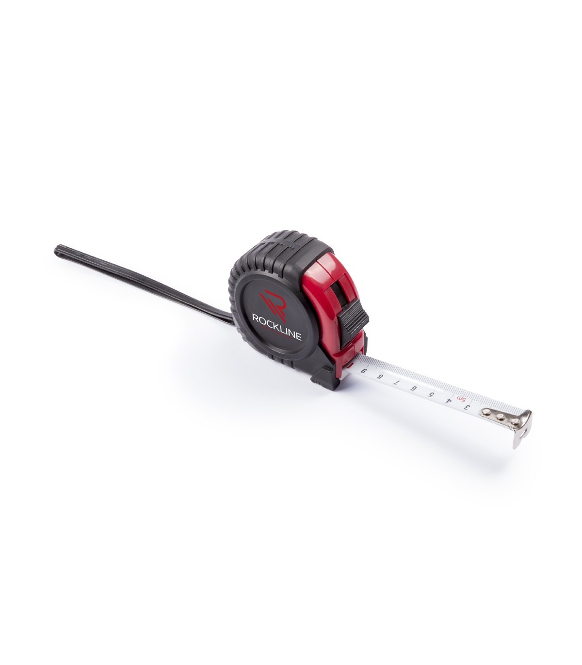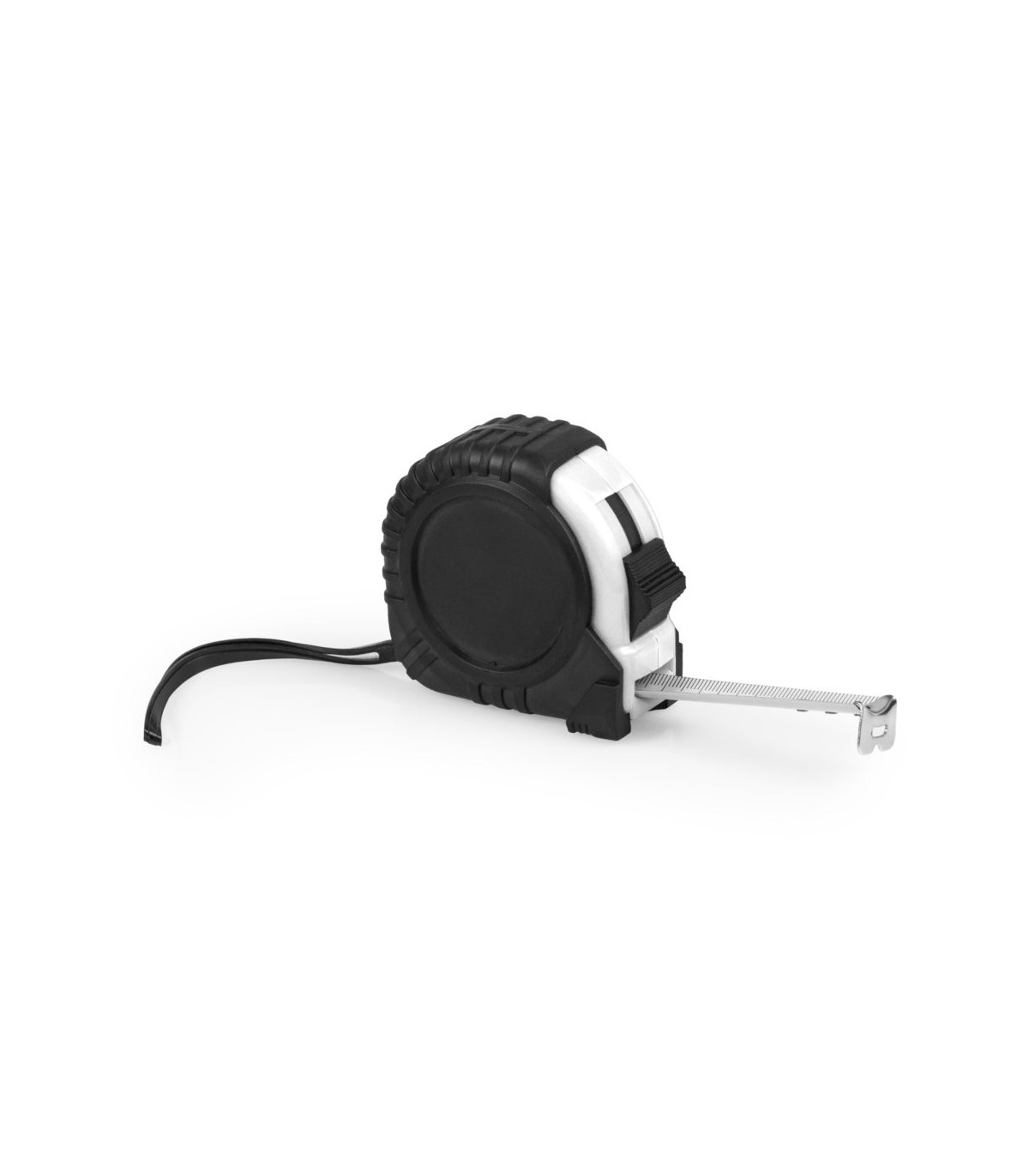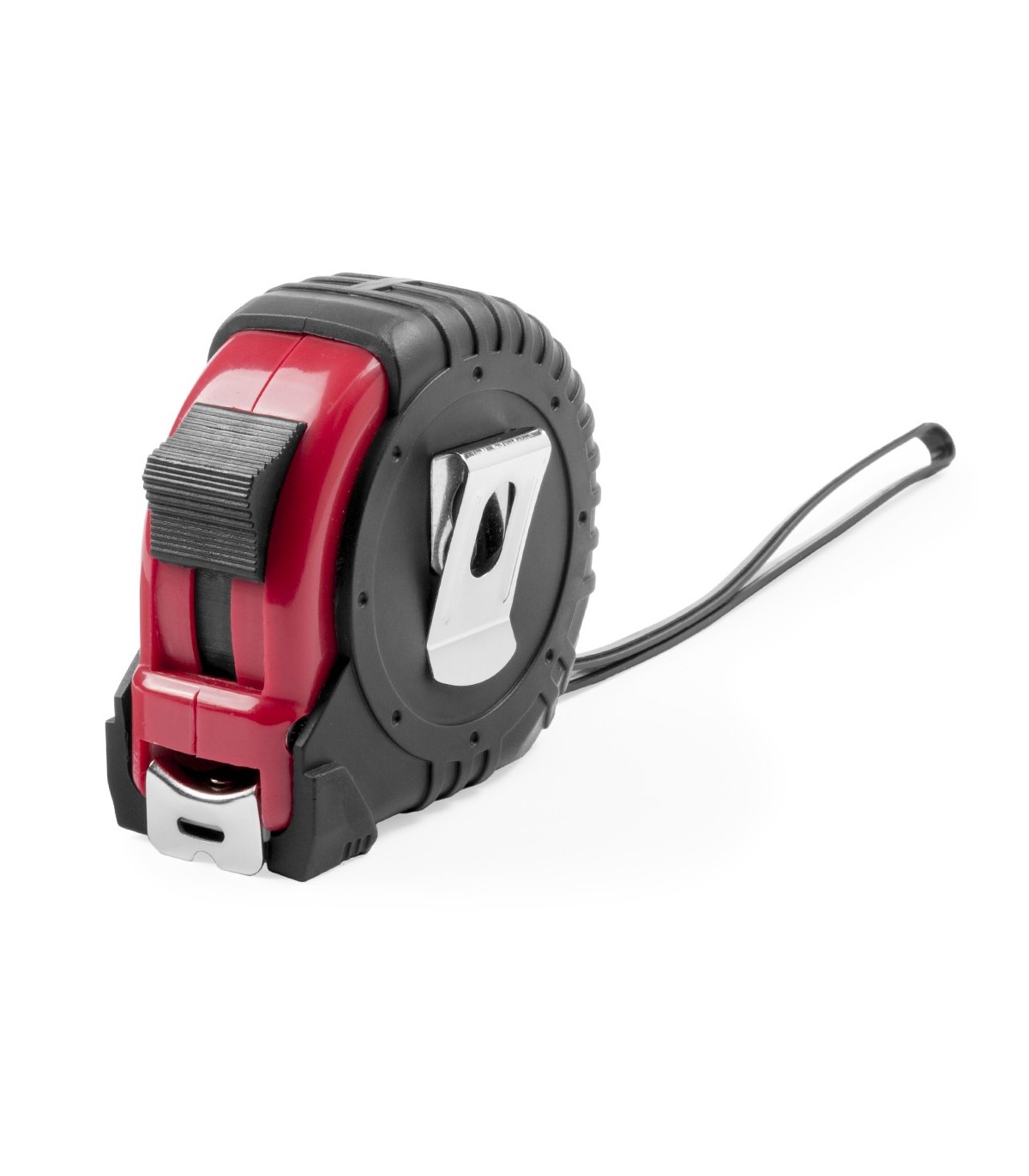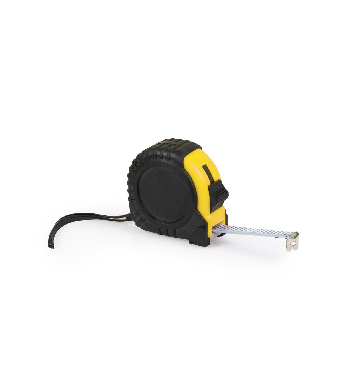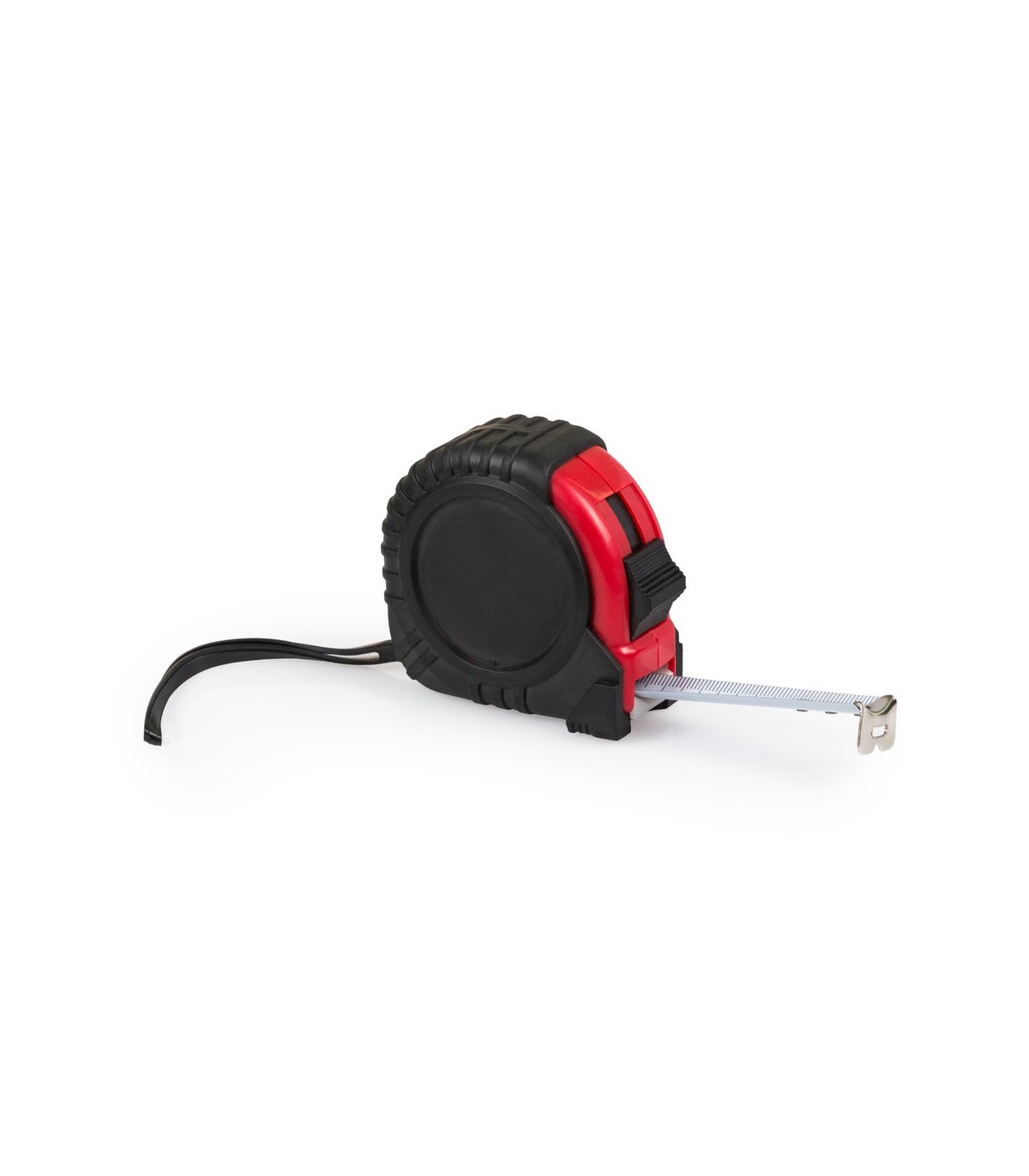 Flexómetro de 5 metros con cuchilla metálica y mecanismo de bloqueo, clip metálico para cinturón y cinta de transporte. Con troquelado especial para personalizar.