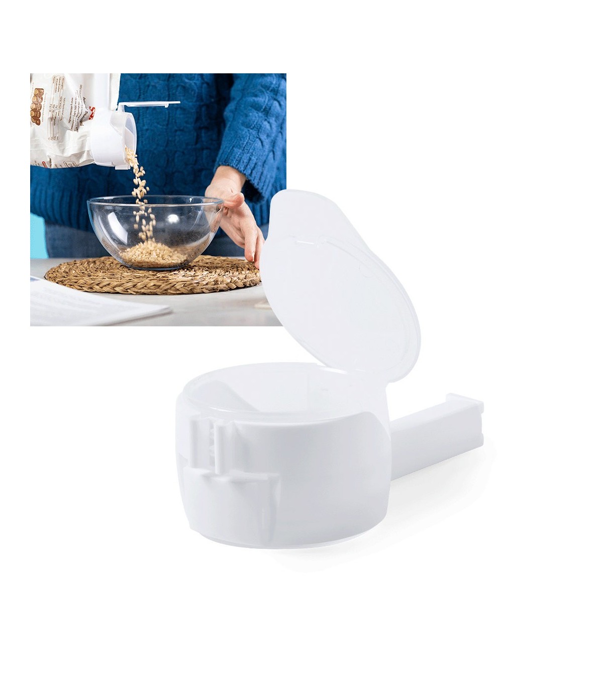 Original clip dispensador en resistente material PP, con pinza universal y tapa de seguridad.