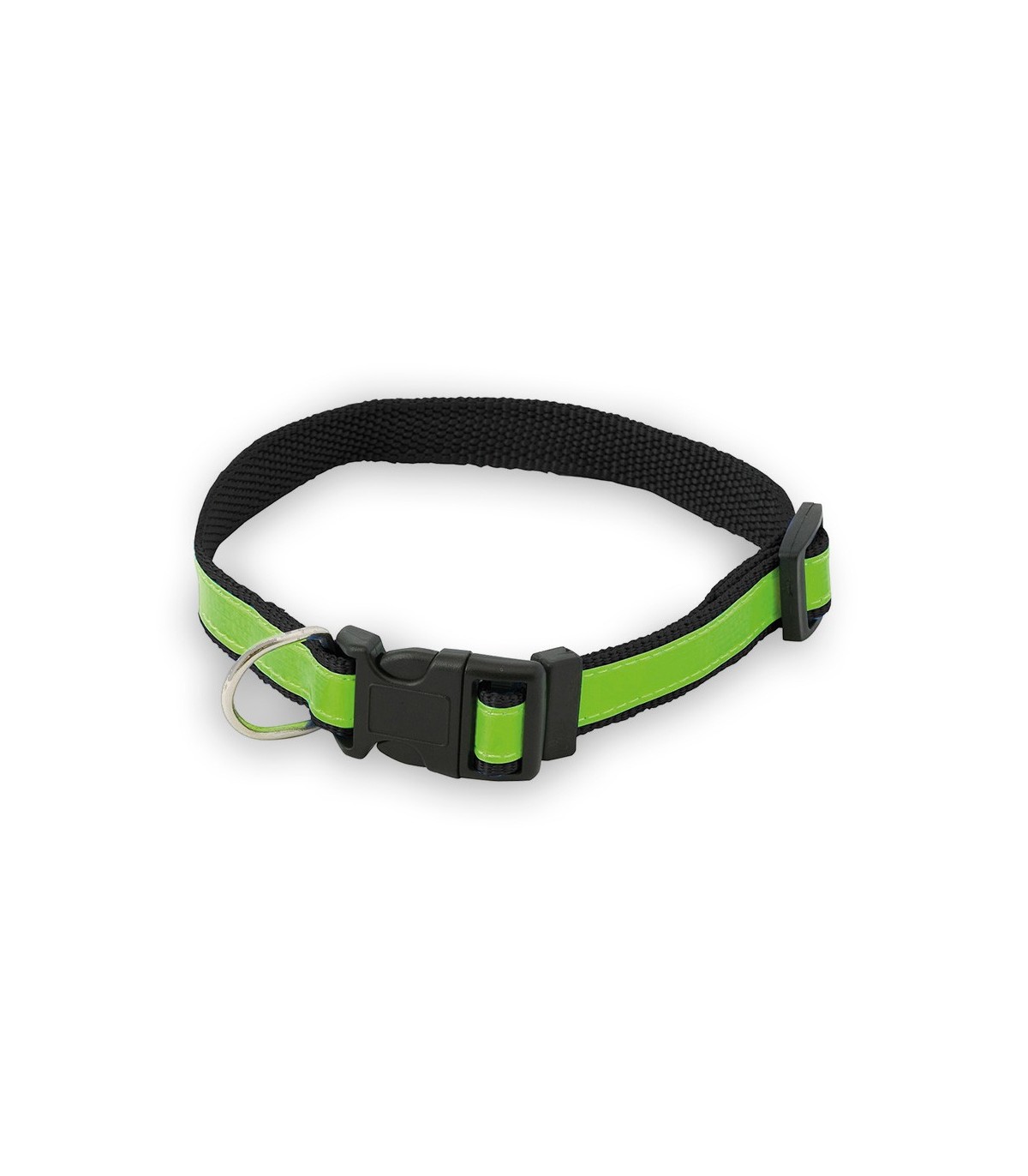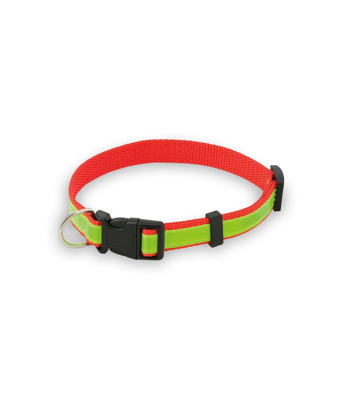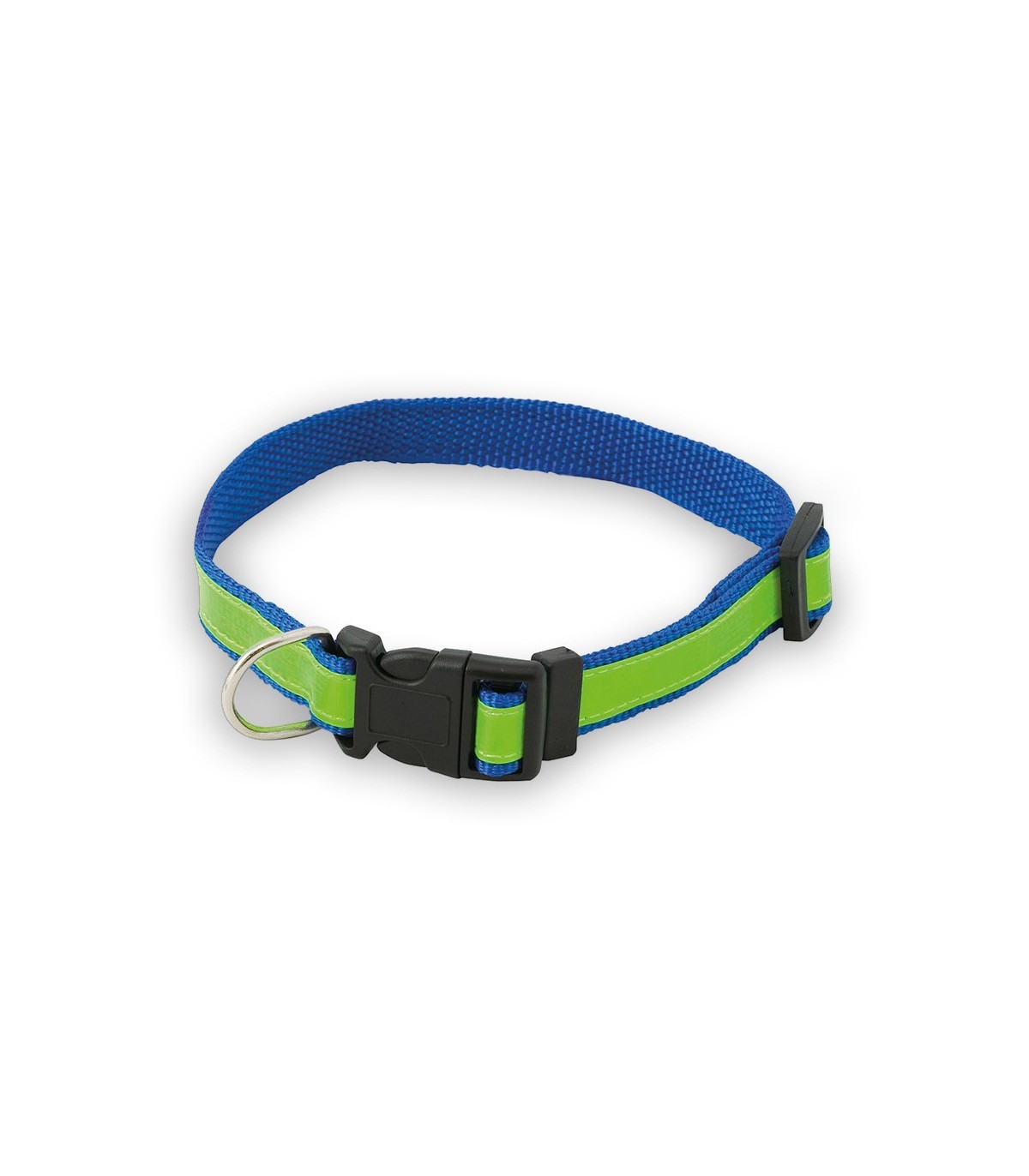 Collar reflectante para mascota en resistente y suave poliéster de colores llamativos para imprimir con tu marca. Con cinta ajustable de cierre de clic y accesorio metálico para cinta de paseo.