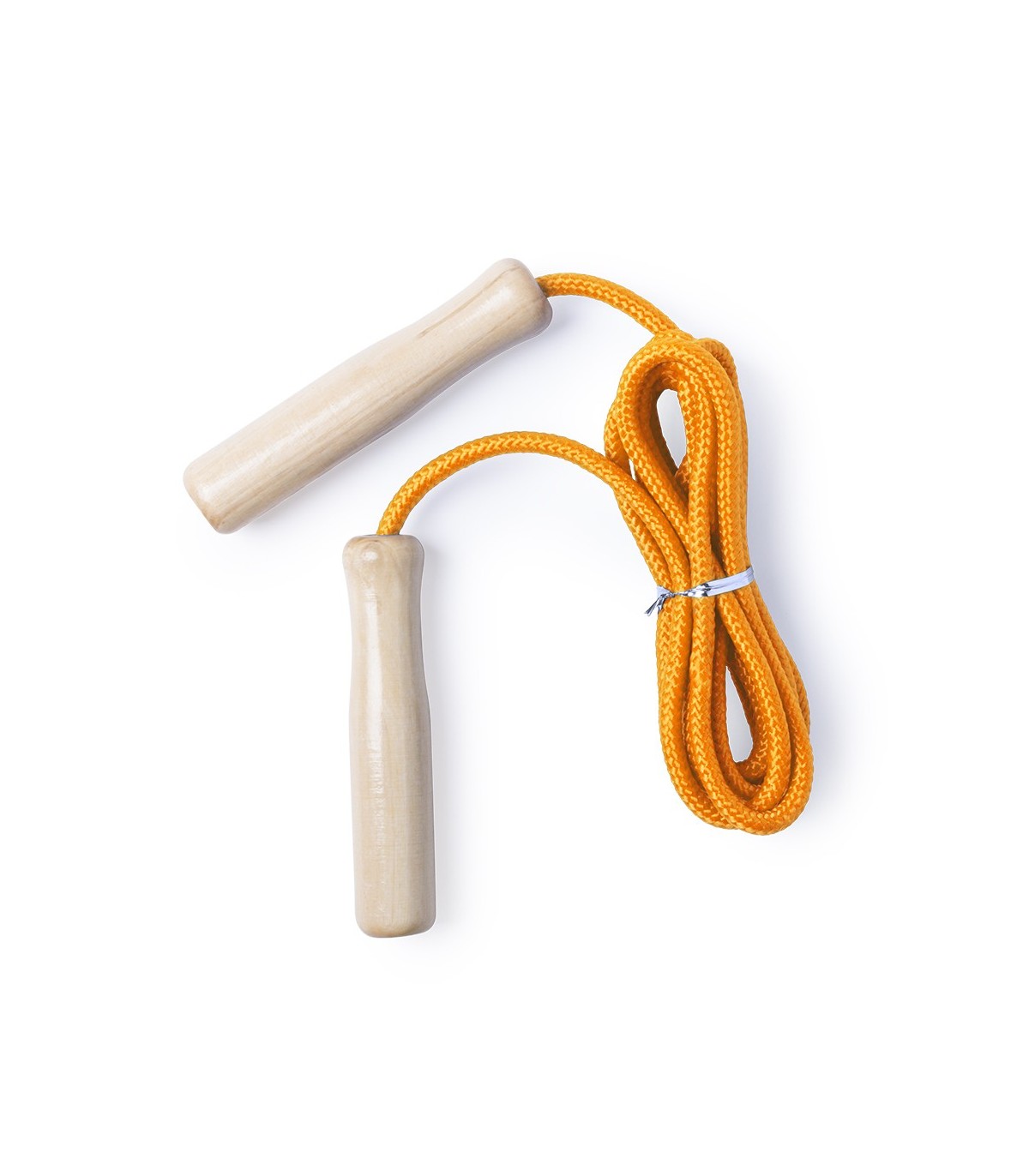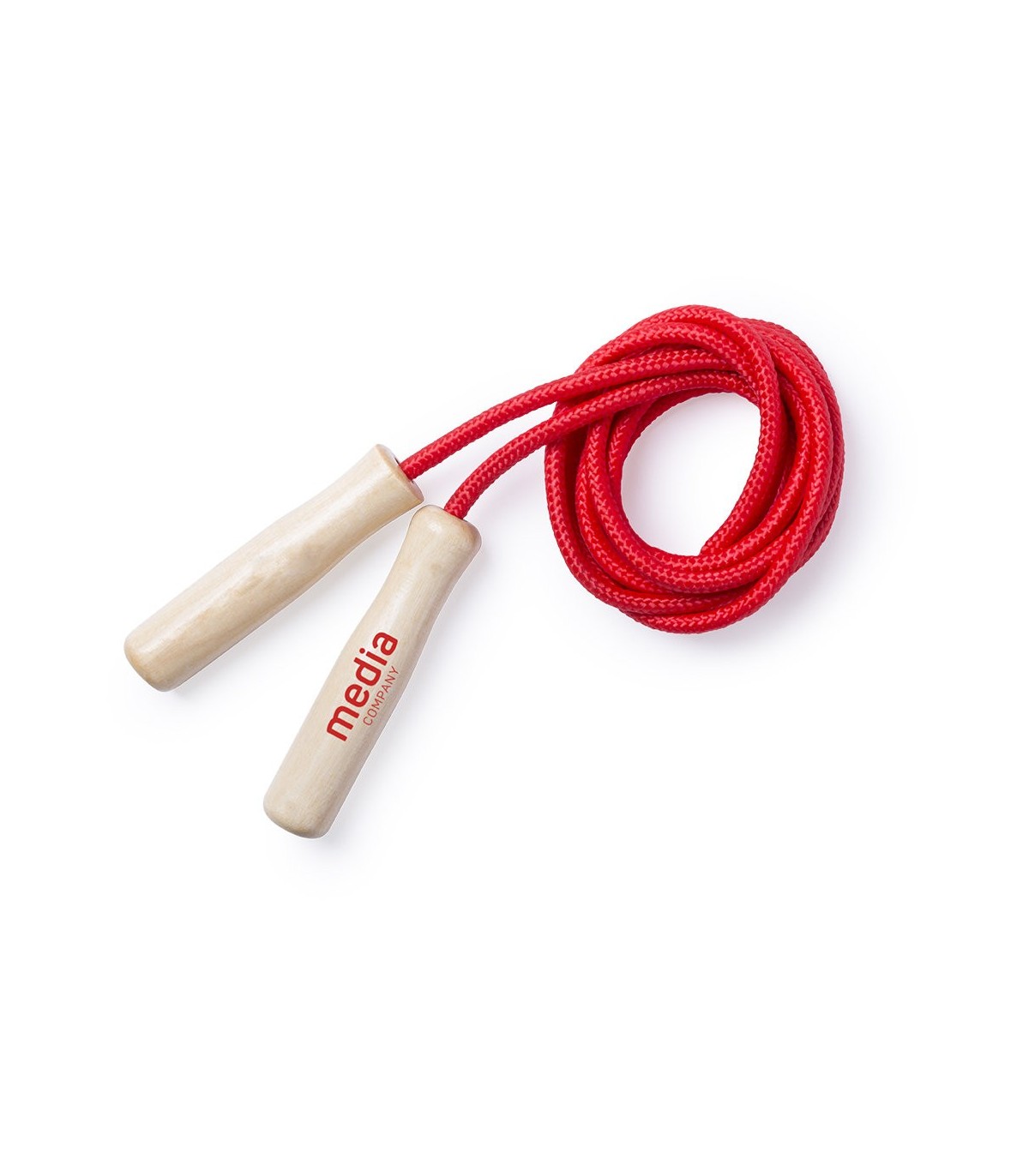 Divertida comba con cuerda extra larga de 240cm de largo en llamativos colores para imprimir con tu marca. Mangos de sujeción en resistente madera barnizada. Presentación plegada.