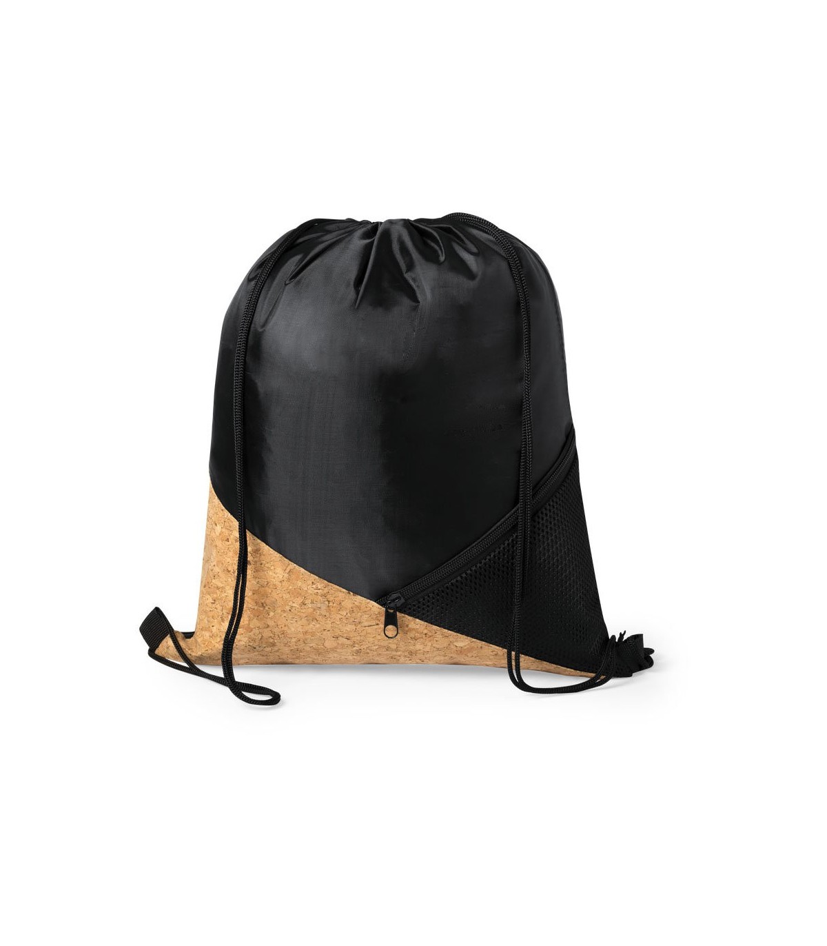 Mochilas fabricadas en Corcho Natural y Poliéster 210D de cuerdas autocierre en color negro, a juego con cremallera, y esquinas reforzadas.