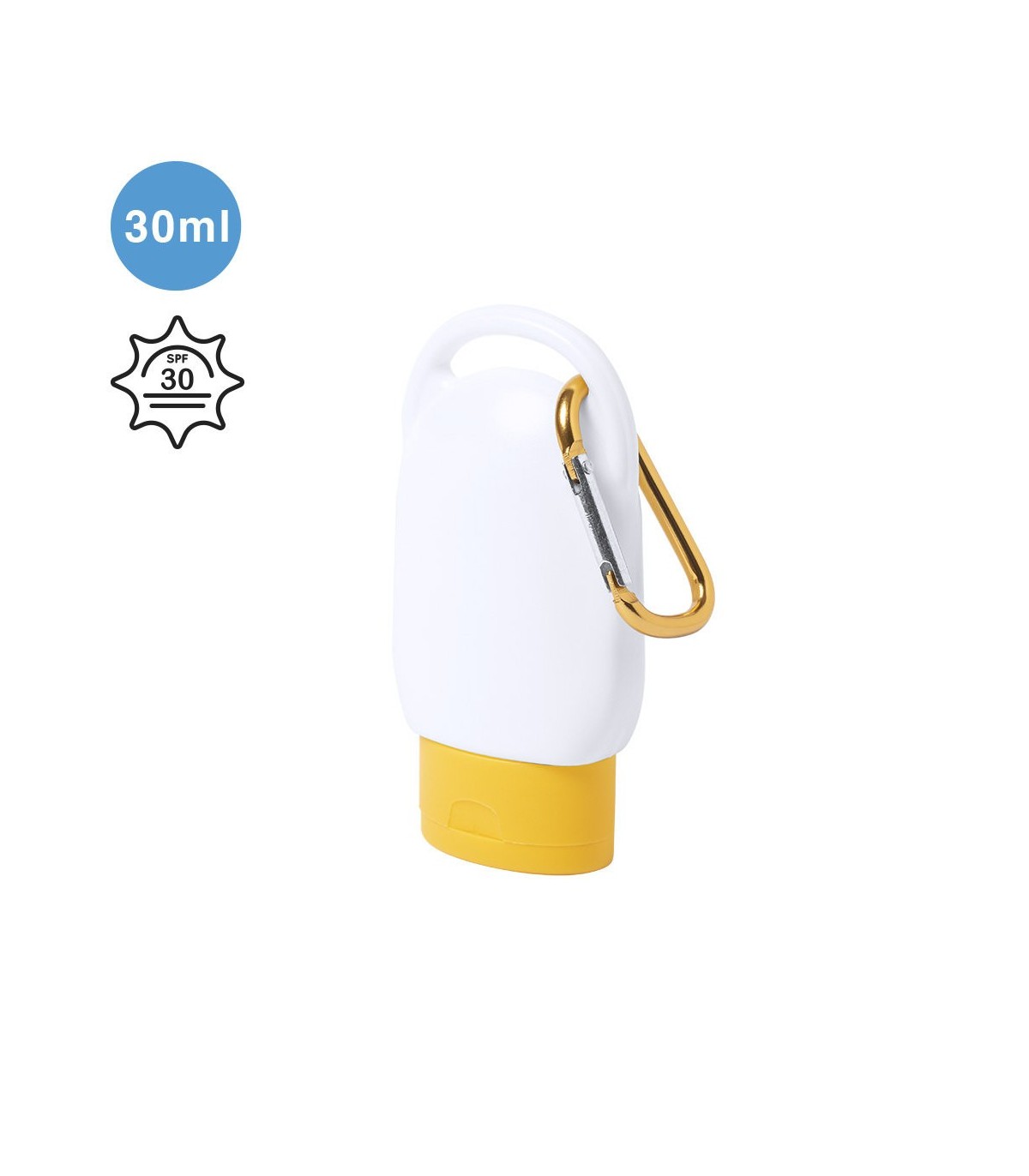 Crema de protección solar factor 30. Presentada en práctico bote de 30ml y acabado frosted. Disponible en variada gama de colores, con mosquetón de transporte a juego.