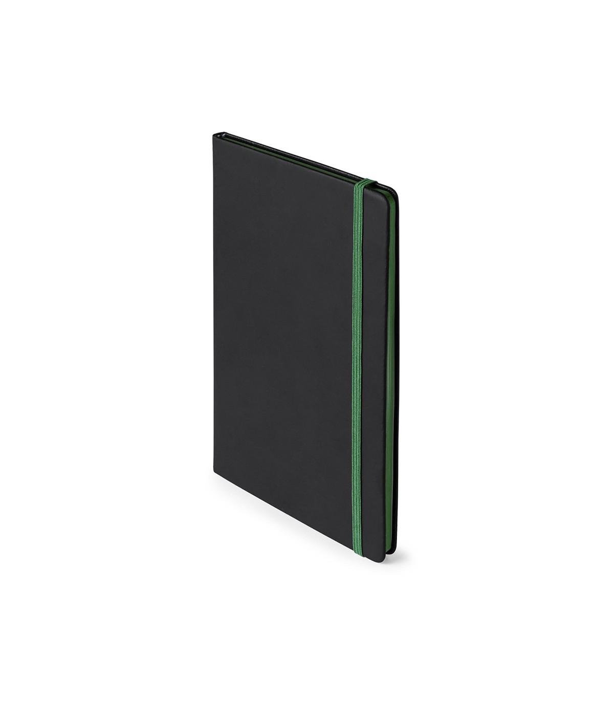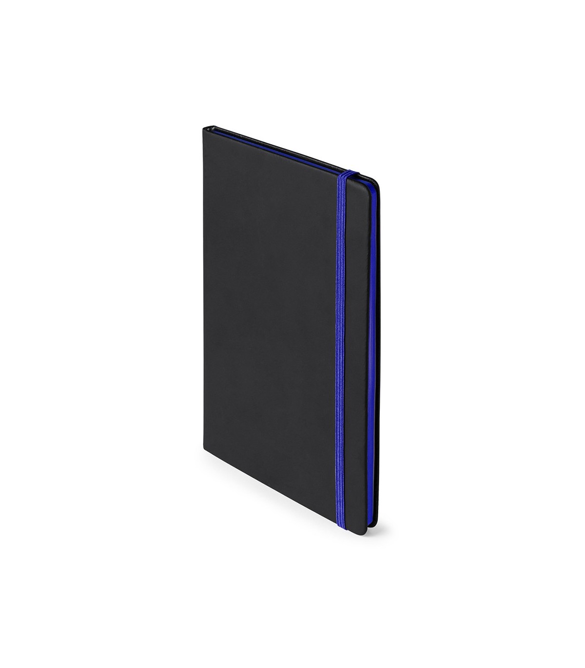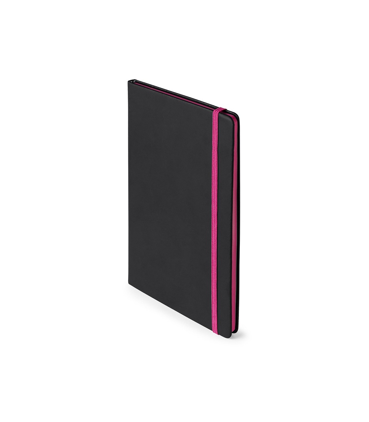 Bloc de notas con tapas de suave tacto acabadas en elegante polipiel negra. De 80 hojas lisas con lomo en divertidos colores, elástico de sujeción y marcapáginas de tela a juego.