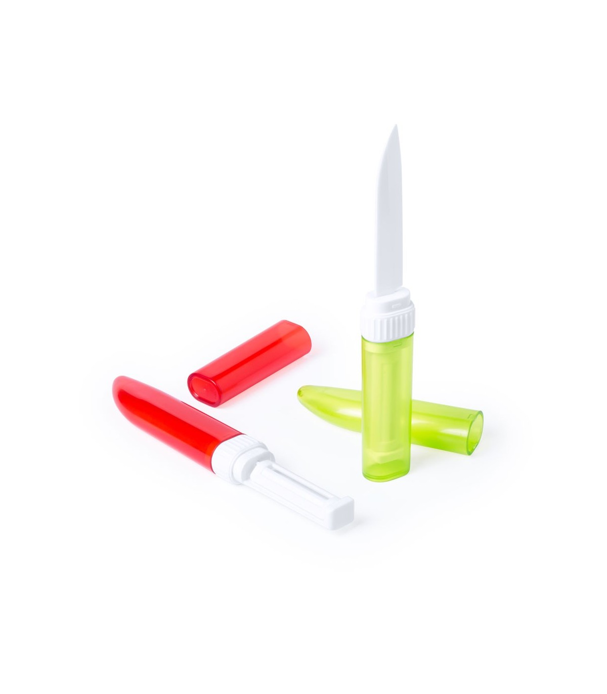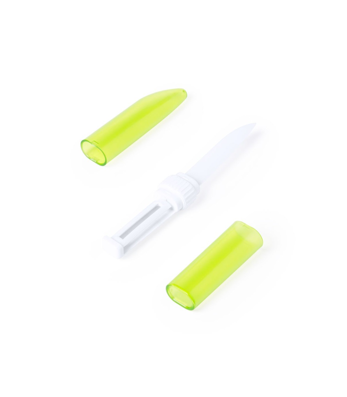Original cuchillo con pelador fabricado en cerámica doble función y capuchas a juego con el color cuerpo ideales como regalos de empresa personalizados.