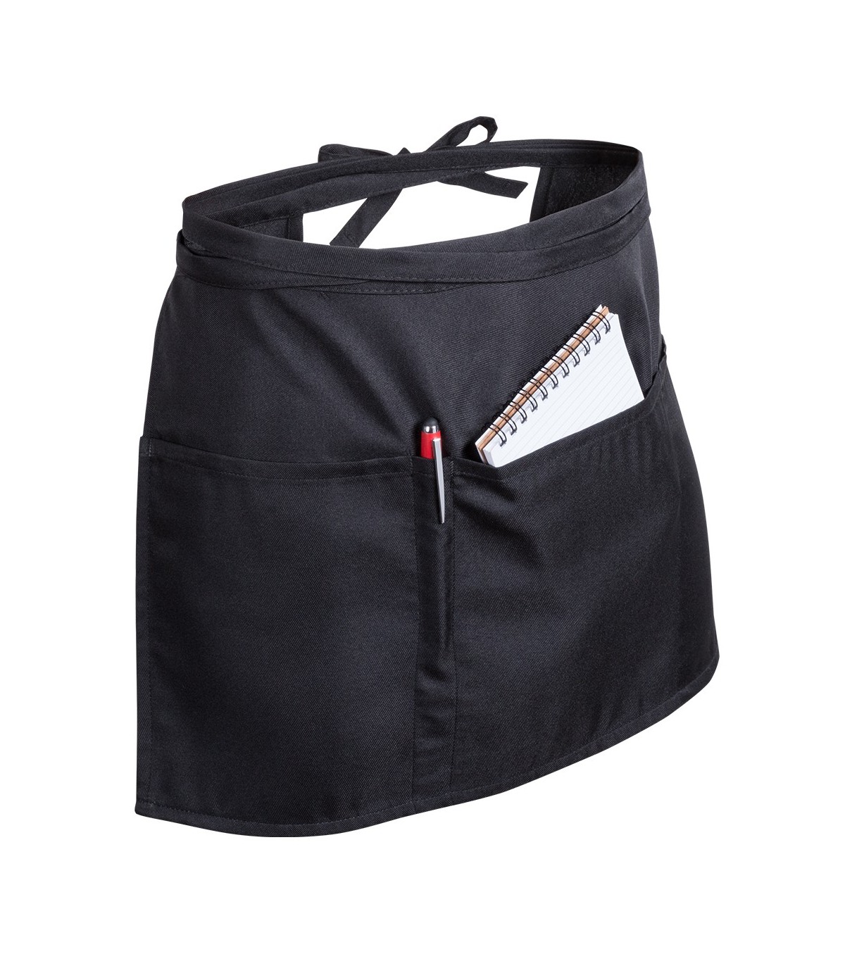 Delantal para cintura en material 100% poliéster de suave acabado en elegante color negro. Con 2 bolsillos grandes, bolsillo mediano y funda par bolígrafo. Ajustable mediante cintas.