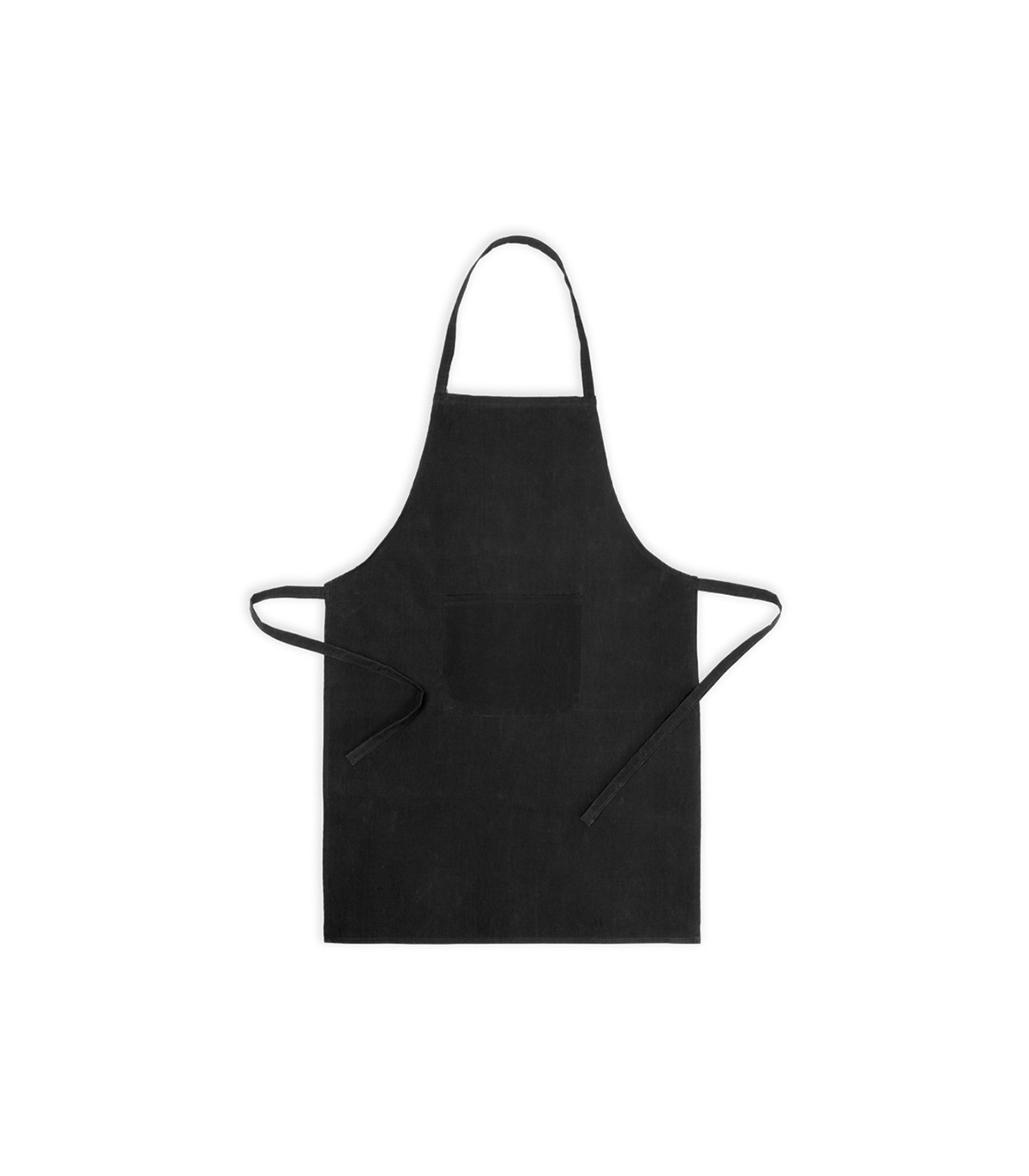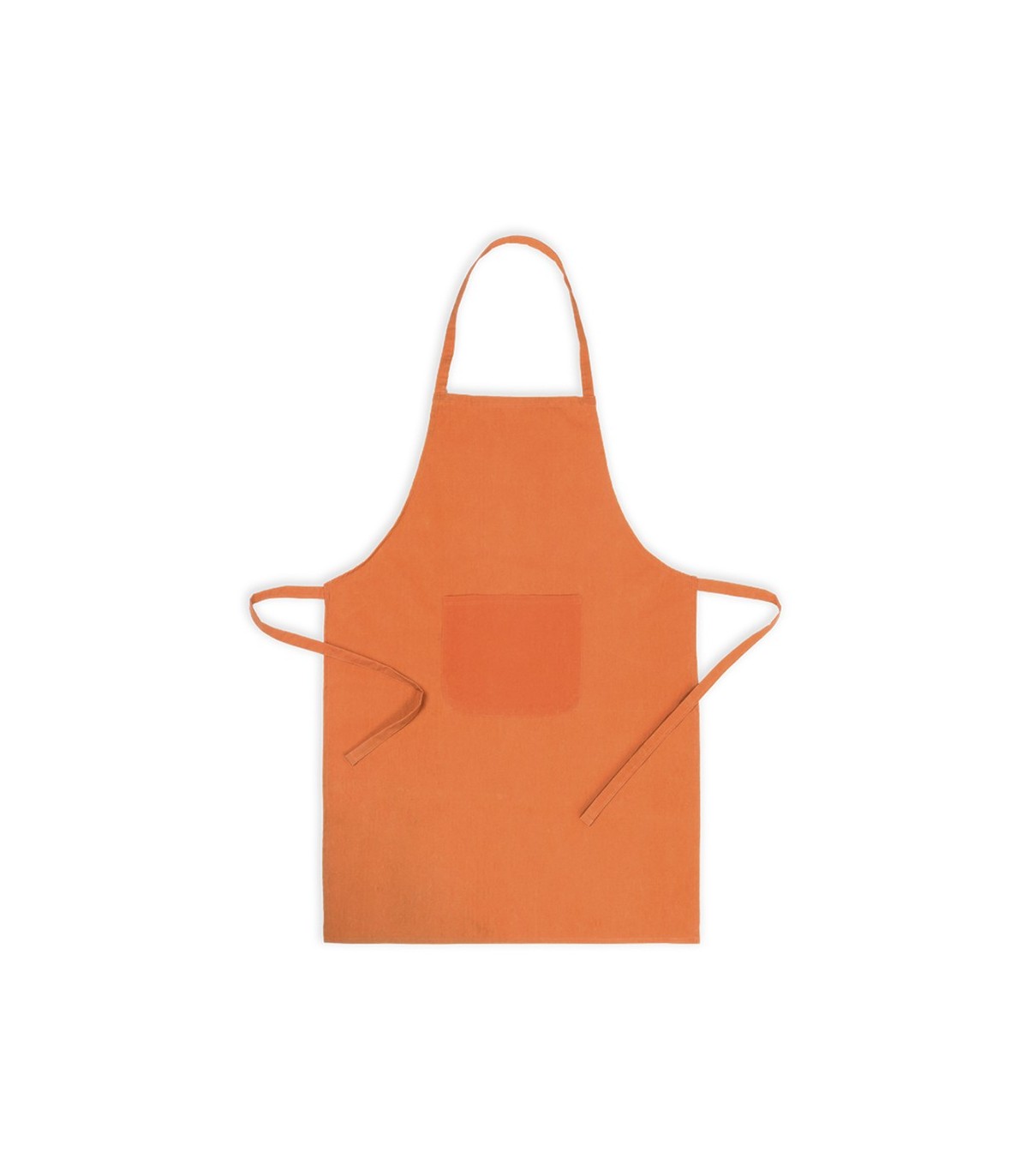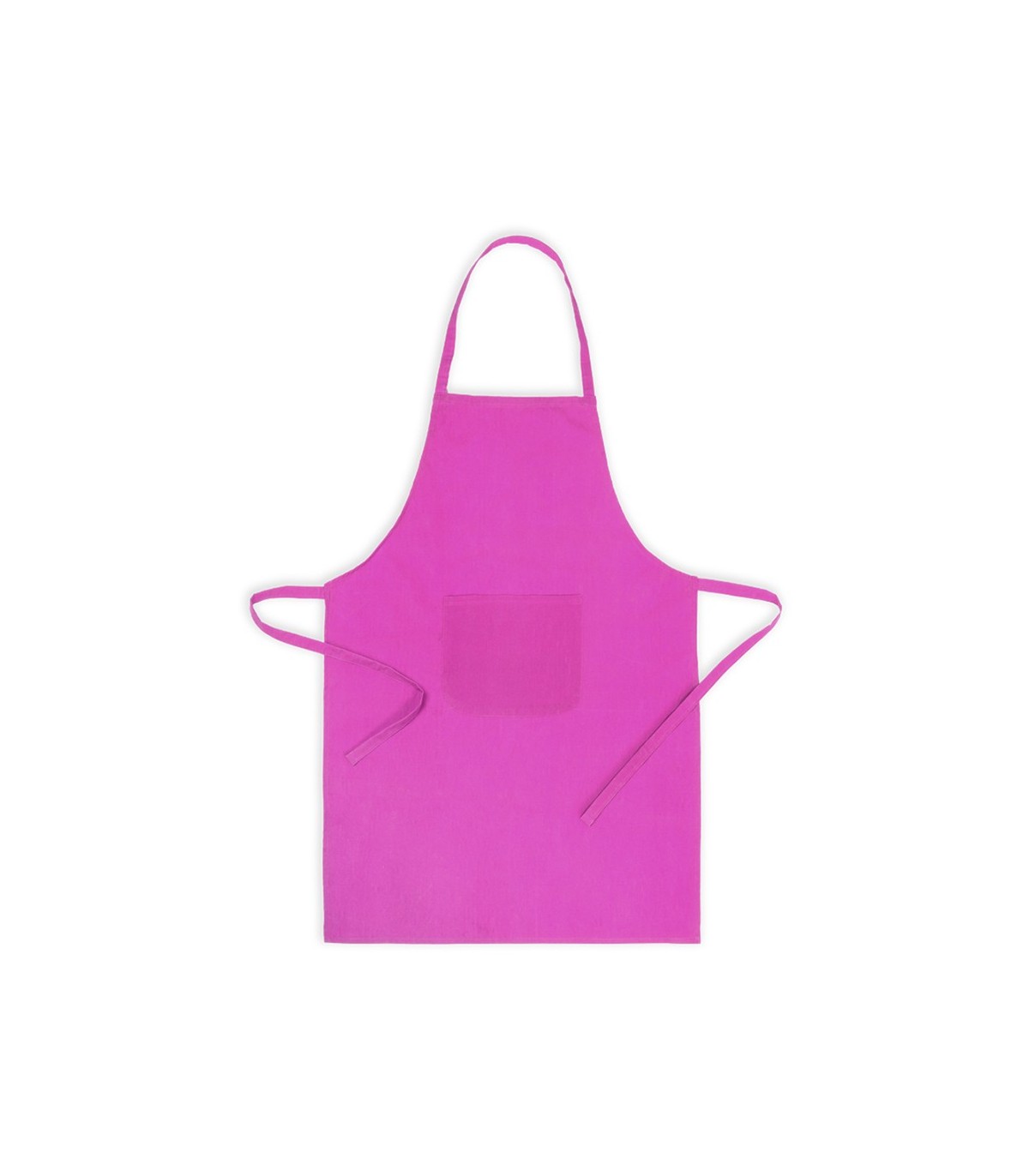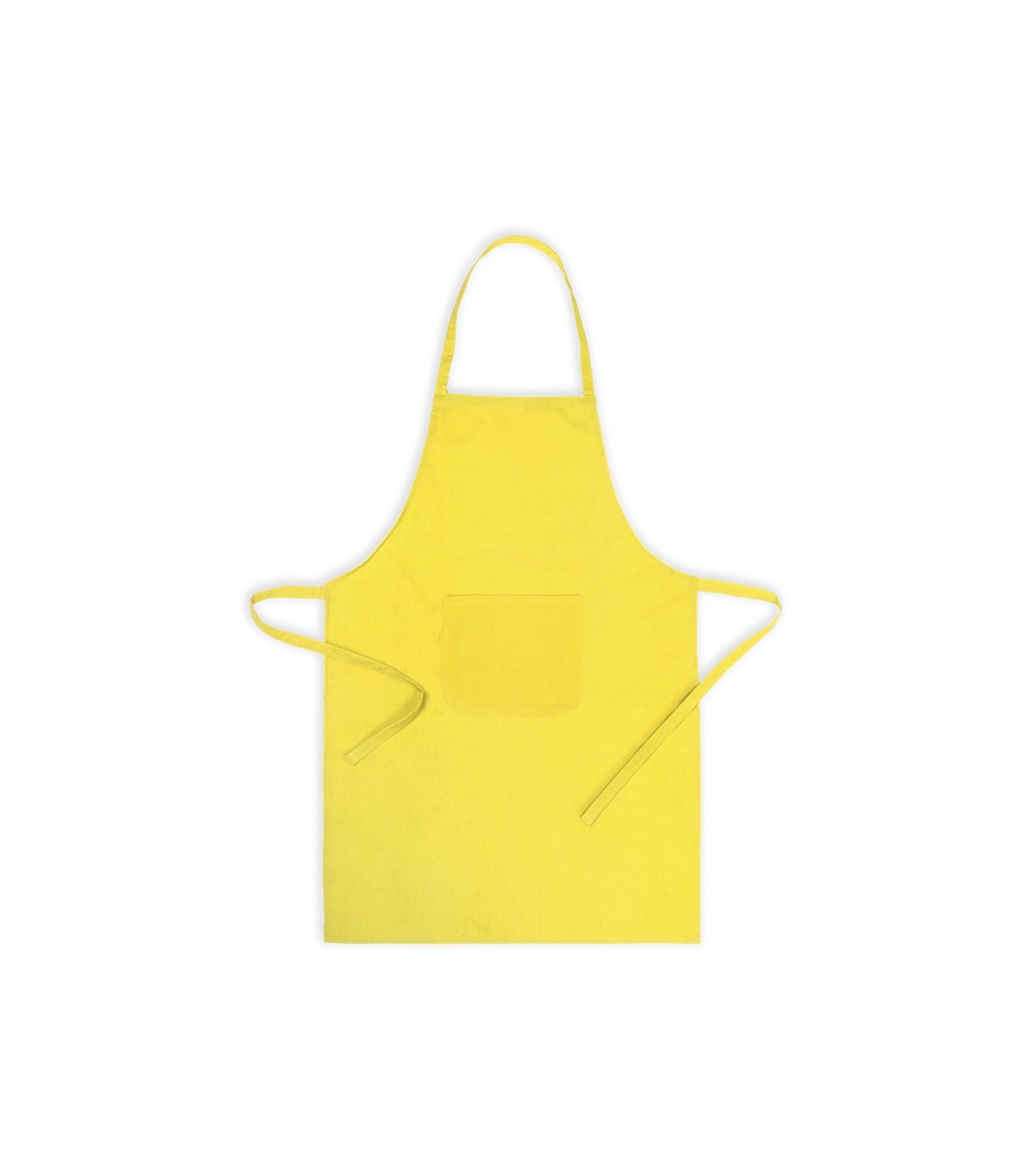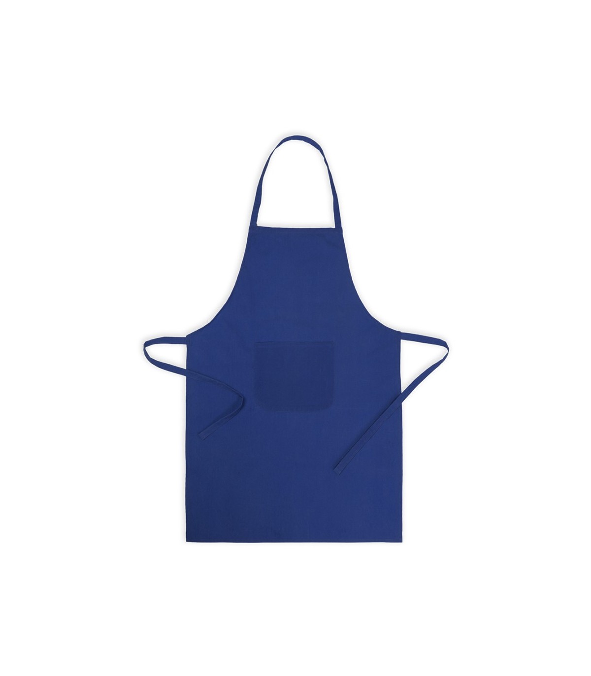 Delantal en material TC -combinado de algodón y poliéster-. en varios colores llamativos para imprimir, con bolsillo frontal y cintas de ajuste. De corte por debajo de la rodilla.