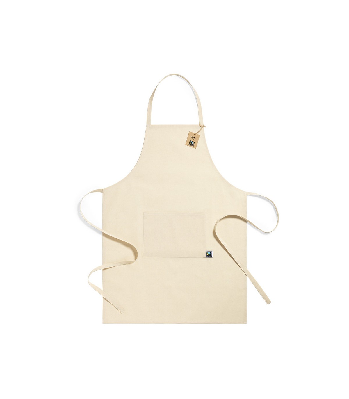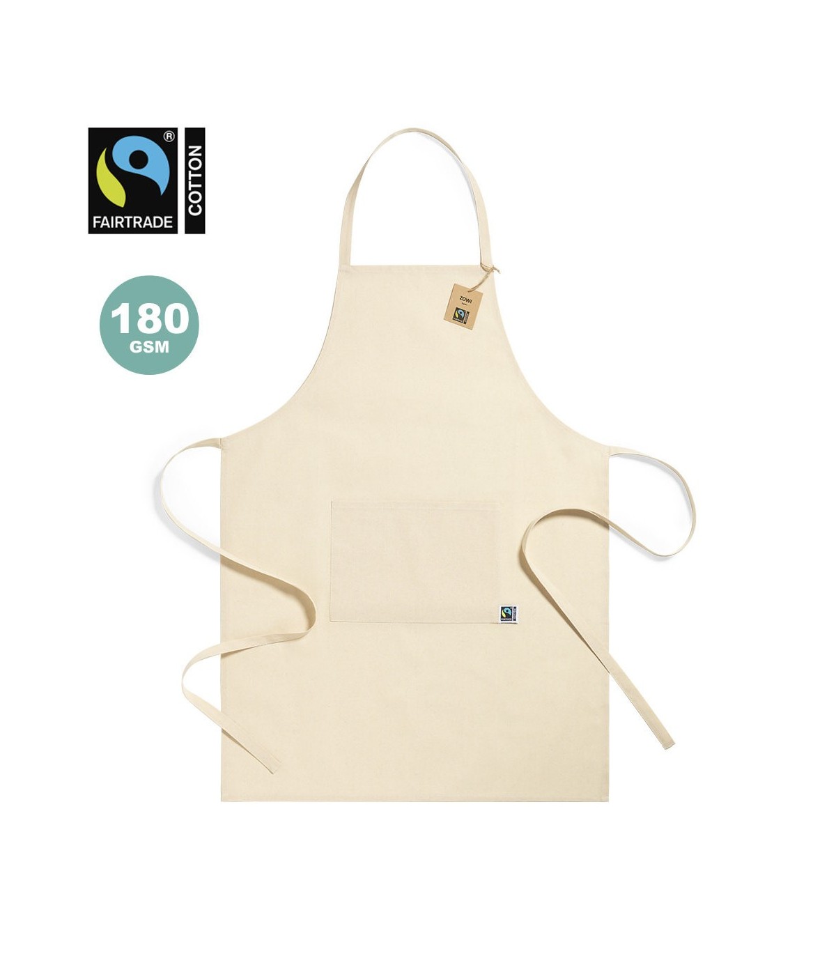 Delantales personalizados fabricado en 100% algodón de 180g/m² en tono natural. Con certificación Fairtrade (Comercio Justo). Con bolsillo frontal y cintas de ajuste.