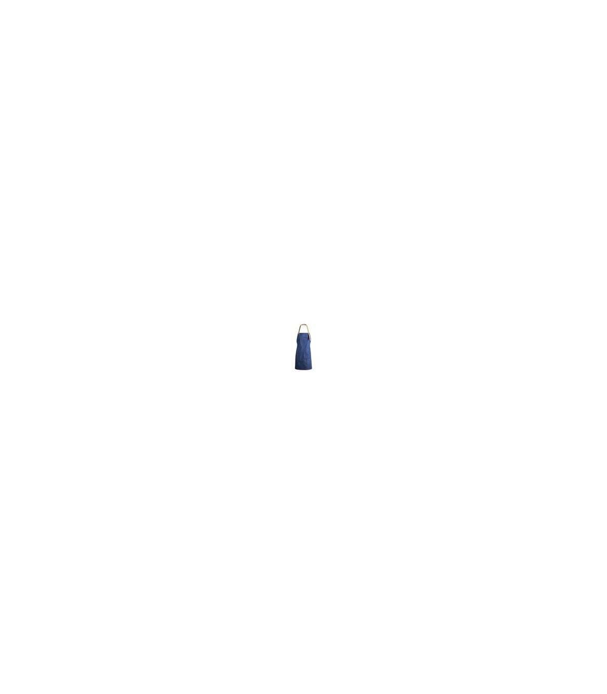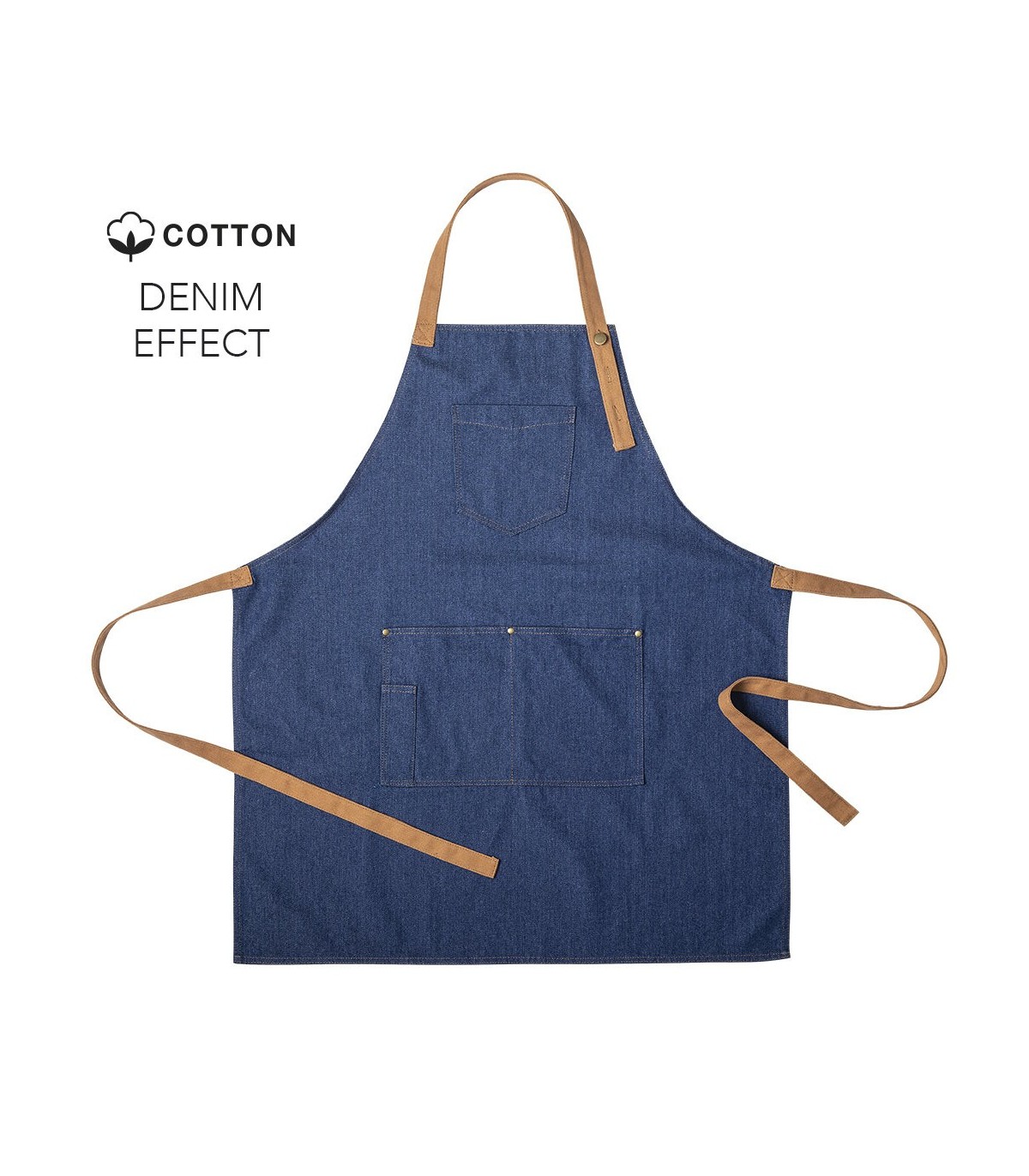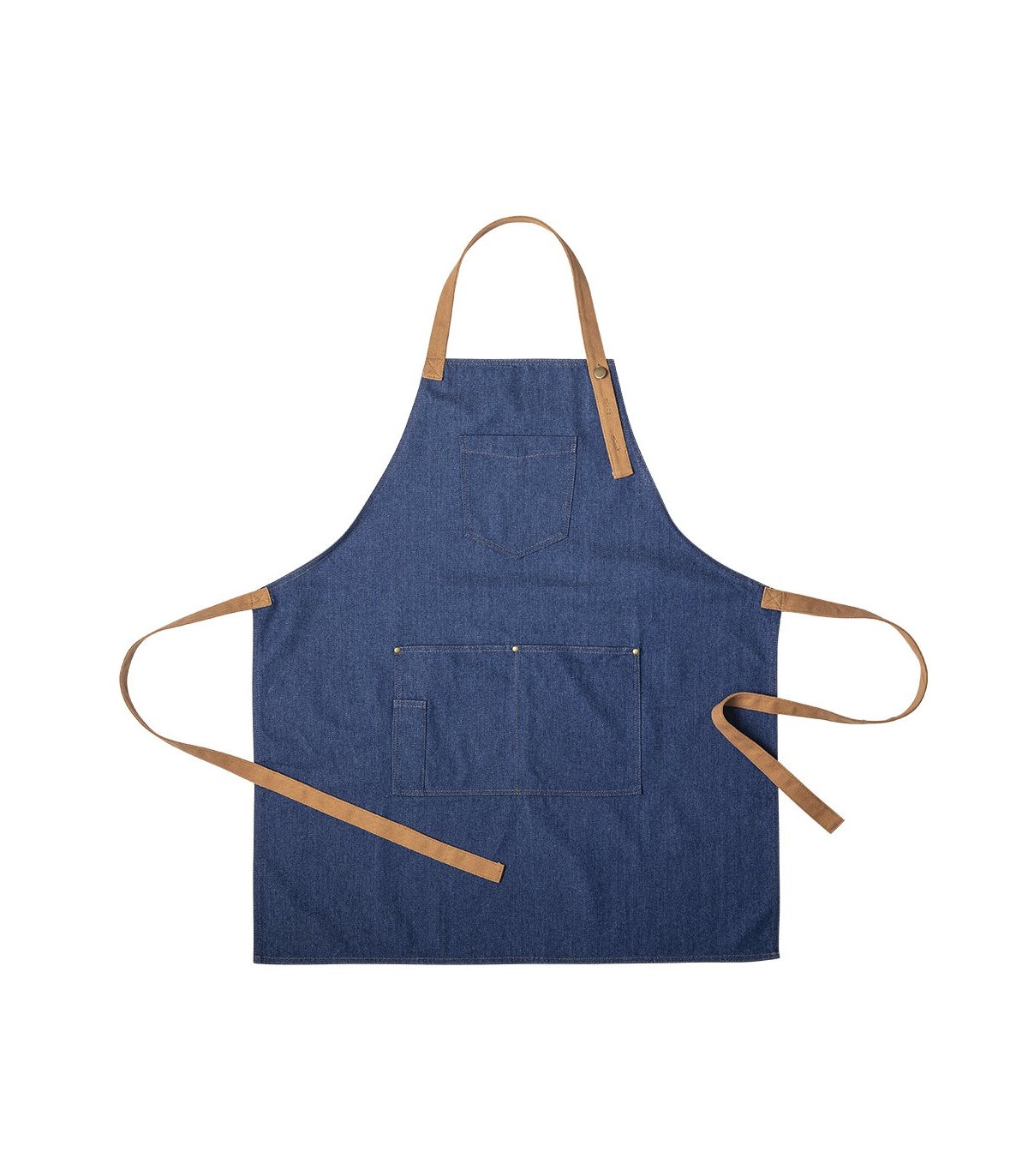 Delantal de alta calidad en resistente tela de acabado denim. De corte por debajo de la rodilla, con cinta de cuello ajustable por botón, cintas para la cintura en color marrón, reforzadas. Incluye multitud de bolsillos para llevar cómodamente los distintos utensilios, con costuras reforzadas y remaches metálicos.