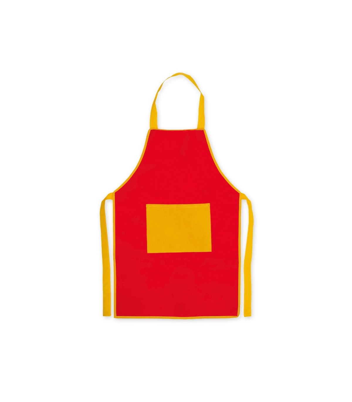 Originales delantales de tela personalizados para regalos de merchandising infantil, en alegre combinación bicolor. Con cintas de ajuste en cuello y espalda.