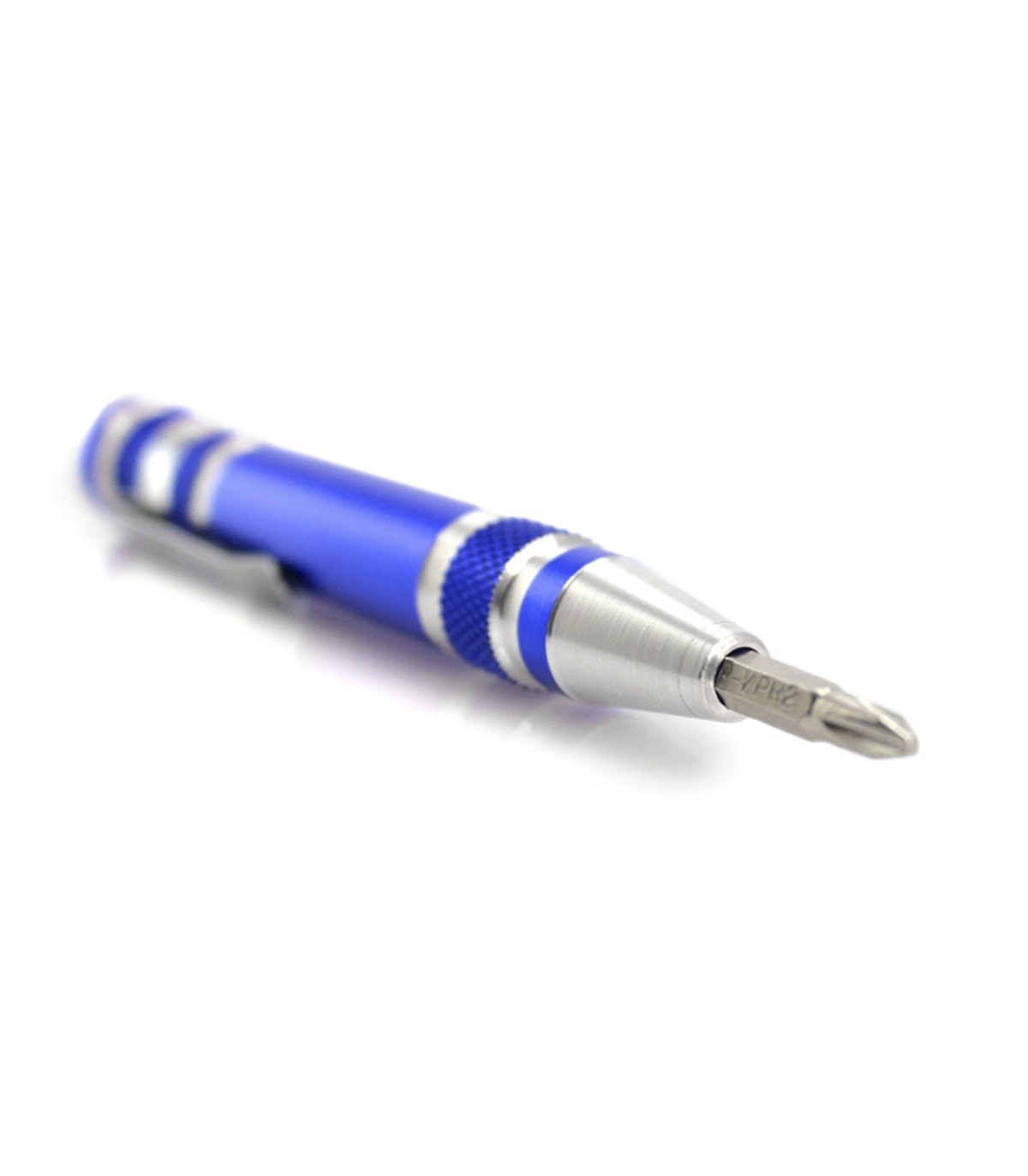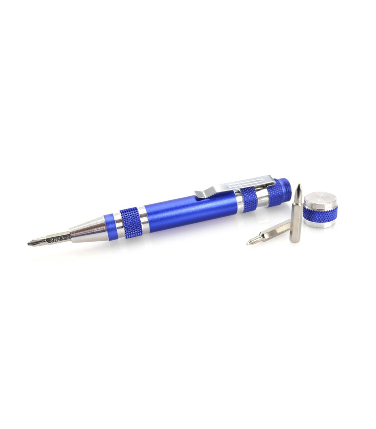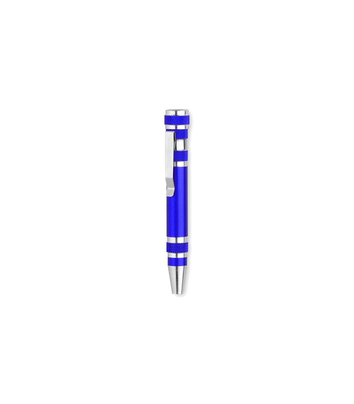 Multiherramienta de aluminio de 6 accesorios en variada gama de vivos colores metalizados. Con cuerpo anti deslizante y clip metálico. Incluye 6 cabezales destornilladores planos y de estrella.