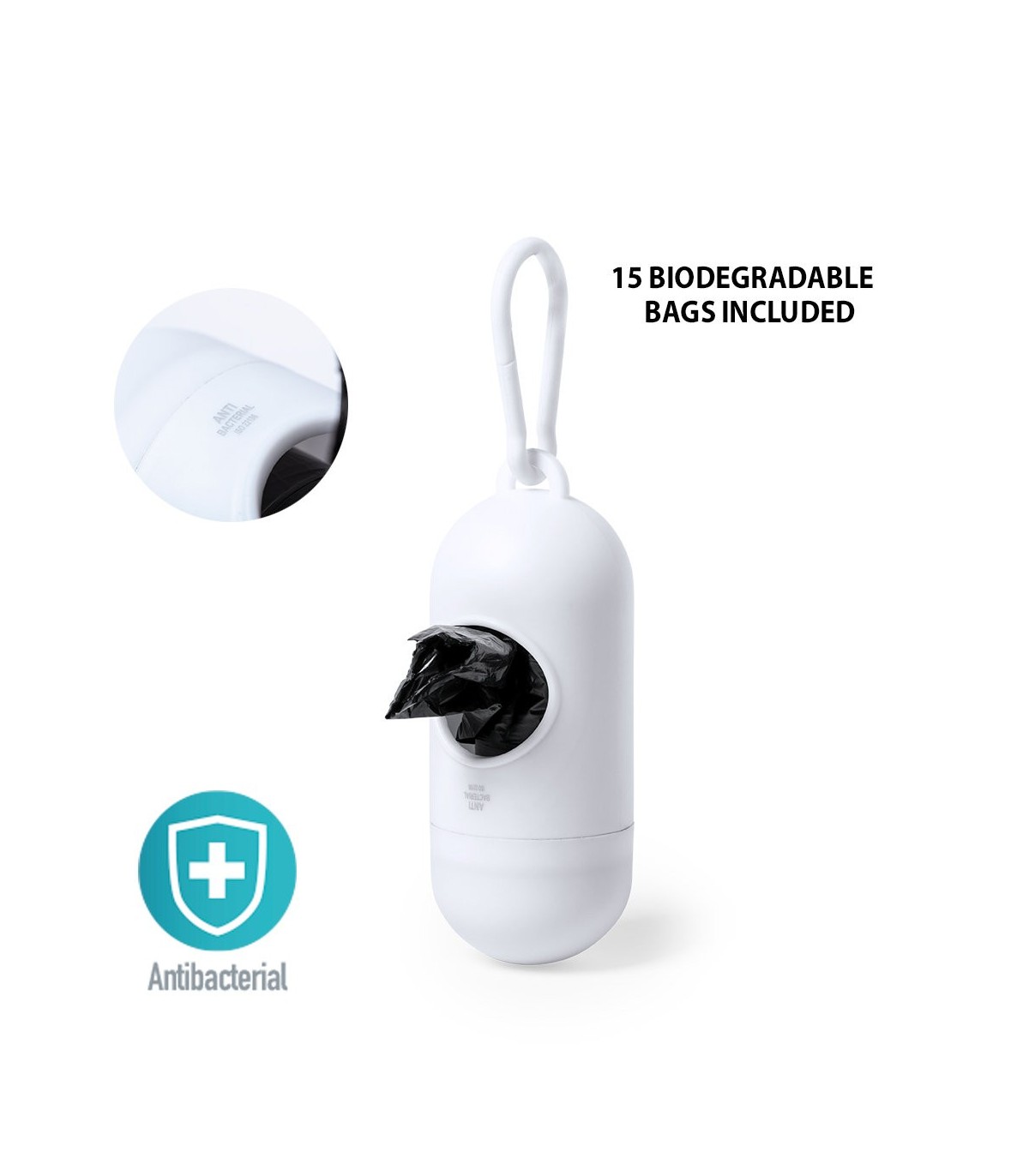 Dispensador de bolsas antibacteriano para mascotas, con resistente cuerpo en acabado sólido. Mosquetón de transporte a juego, con 15 bolsas biodegradables incluidas. Presentado en bolsa individual. Los productos con tratamientos antibacterianos son capaces de reducir drásticamente las cargas bacterianas presentes en las superficies de los materiales, gracias a la incorporación de agentes microbianos permanentes estáticos, con alta efectividad para inhibir y prevenir la contaminación bacteriana. Artículo de acuerdo al estándar ISO 22196, que determina la actividad antibacteriana en materiales plásticos y superficies no porosas, lo que permite conocer la efectividad de inhibición microbiana que tienen los aditivos sobre los objetos tratados mediante una evaluación cuantitativa.