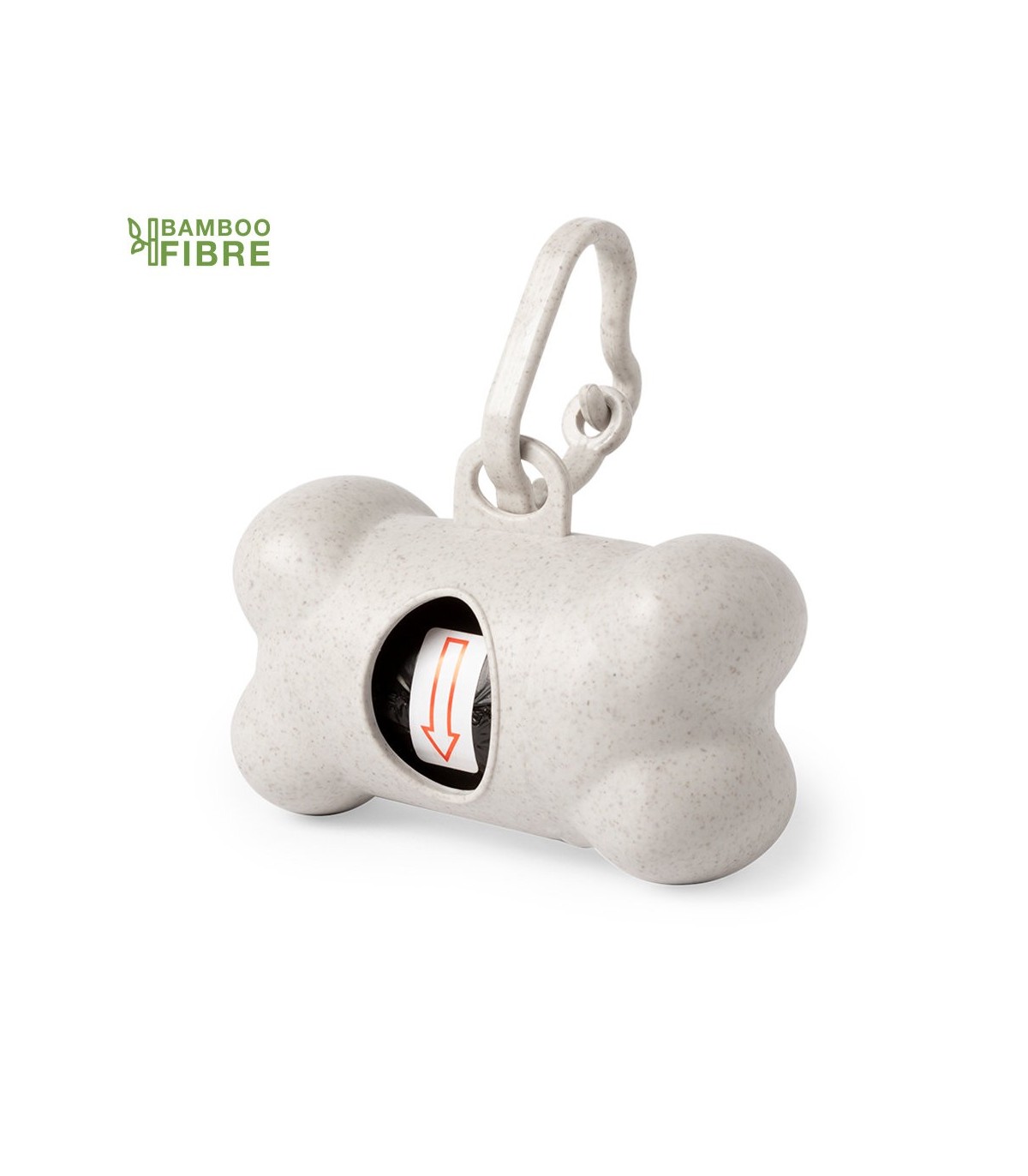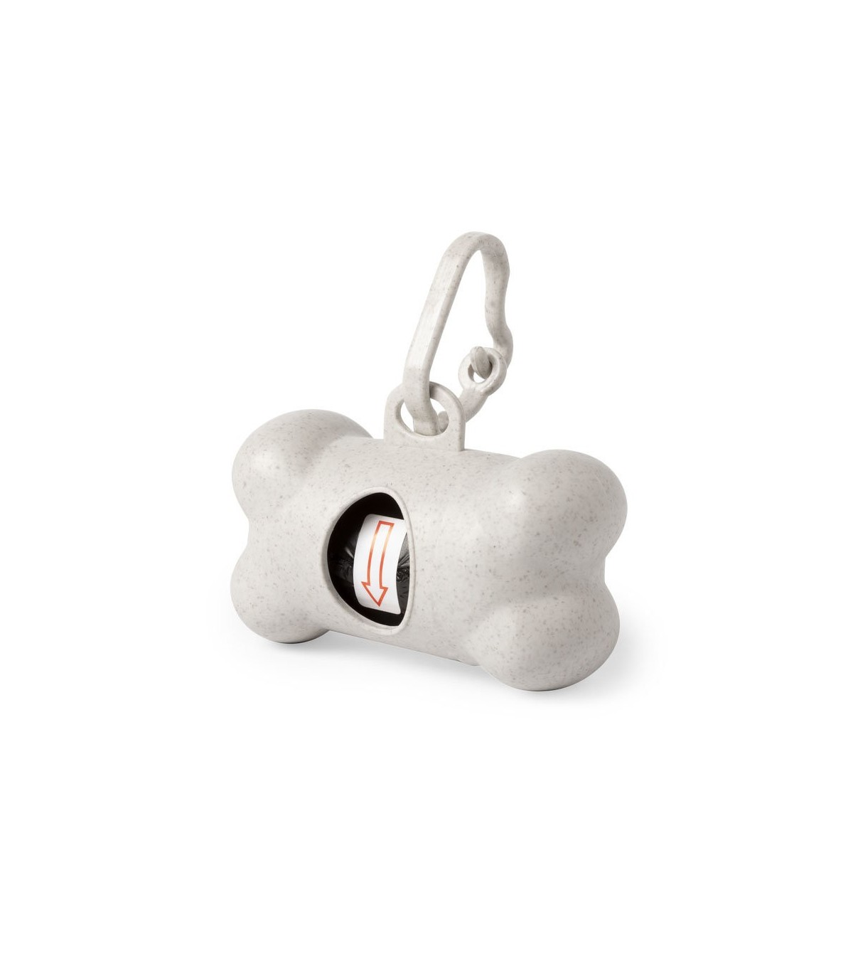 Dispensador de bolsas para mascotas fabricado en fibra de bambú. Con diseño de hueso, mosquetón de transporte a juego y 15 bolsas biodegradables incluidas.