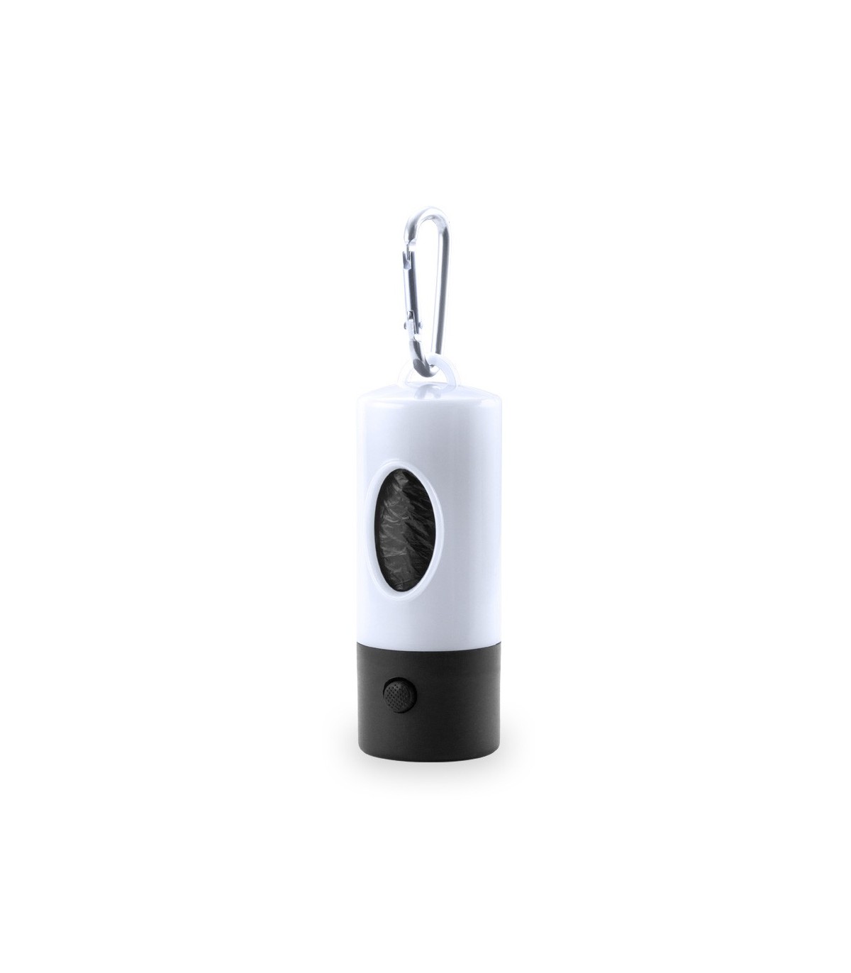 Dispensador de bolsas personalizados con linterna led, mosquetón para sujetar a la correa y 15 bolsitas incluidas, ideales para regalos promocionales de veterinarios.