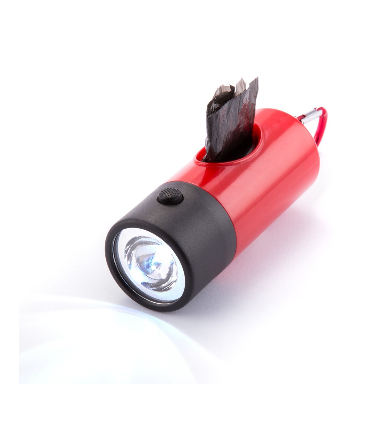 Dispensador de bolsas para mascotas con resistente cuerpo en colores llamativos para imprimir con tu marca. Con linterna LED integrada. Incluye 15 bolsas.