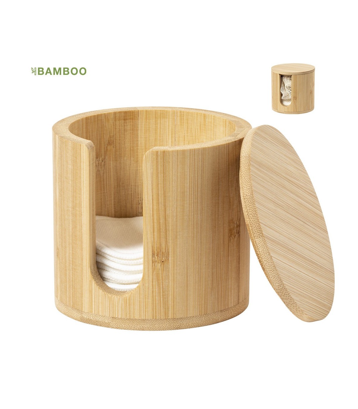 Dispensador de discos desmaquíllantes de fabricación ecológica, fabricado en bambú. Incluye 10 discos de algodón reutilizables y bolsa de lavado.
