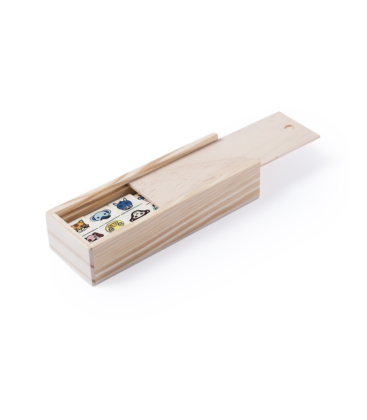 Divertido dominó de animalitos en madera. Con 28 piezas de madera y presentado en estuche de madera con tapa.